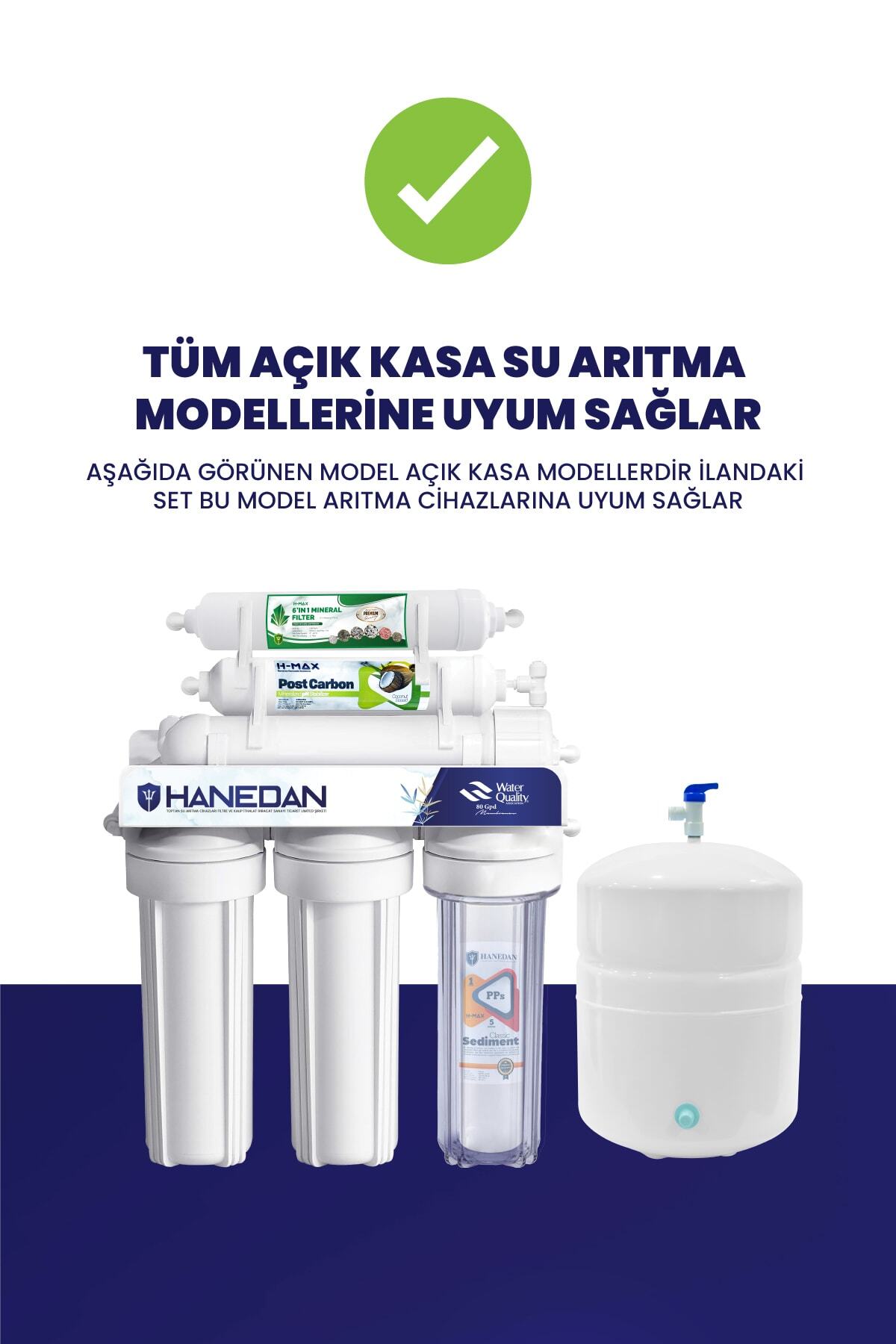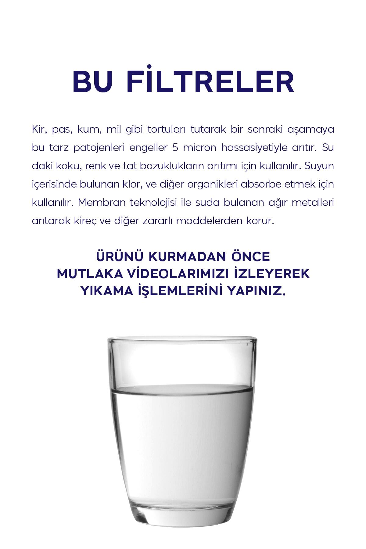 Önemli Uyarı! Ürünün montajı sırasında en önemli nokta filtre yıkama aşamasıdır. 2. filtrede bulunan carbonların diğer filtrelere gitmemesi ve filtre ve diğer aksanları tıkamaması için yapılması gereken en önemli işlem ilk 3 filtrenin yıkamasıdır. İlk 3 filtrenin yıkamasını doğru bir şekilde yaptıktan sonra cihaz doldur boşalt yapılmalıdır. Düzgün bir şekilde montajı yapılmayan ürün cihazınızı bozacaktır. Ürün İçeriği Açık Kasa Filtre Seti 1 Adet H-MAX 5 Micron Sediment Filtre