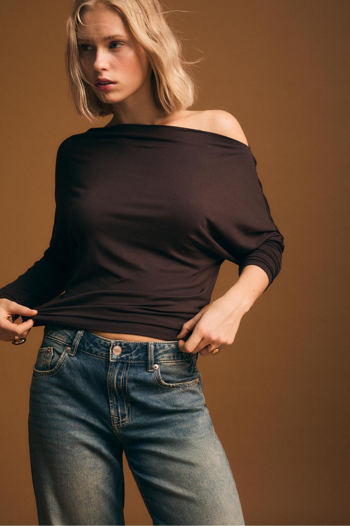 Asimetrik yakalı, manşetli uzun kollu ve omuzları açıkta bırakan tasarım.