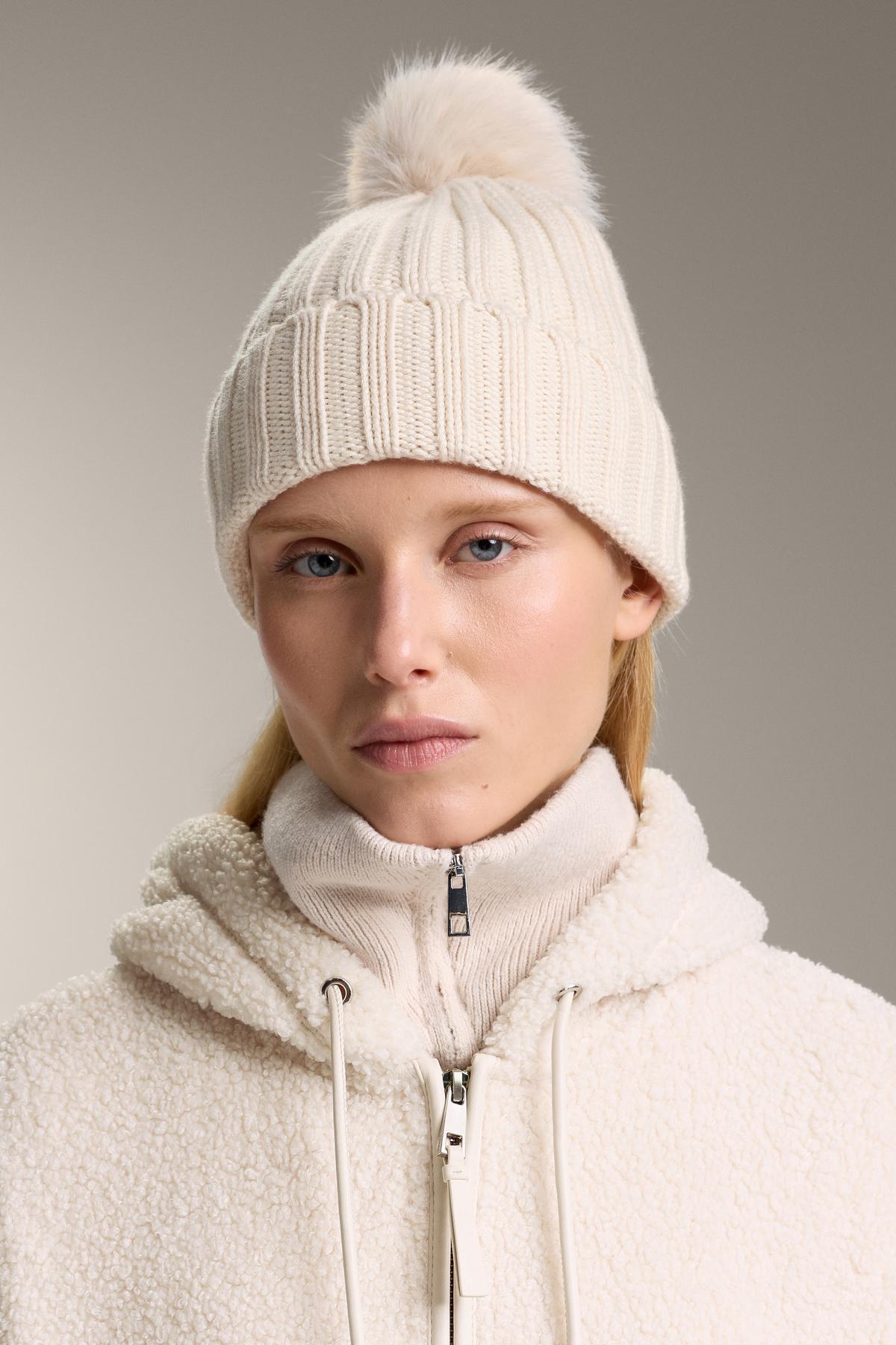 • Pamuklu karışımında ponpon aplikeli örgü bere.