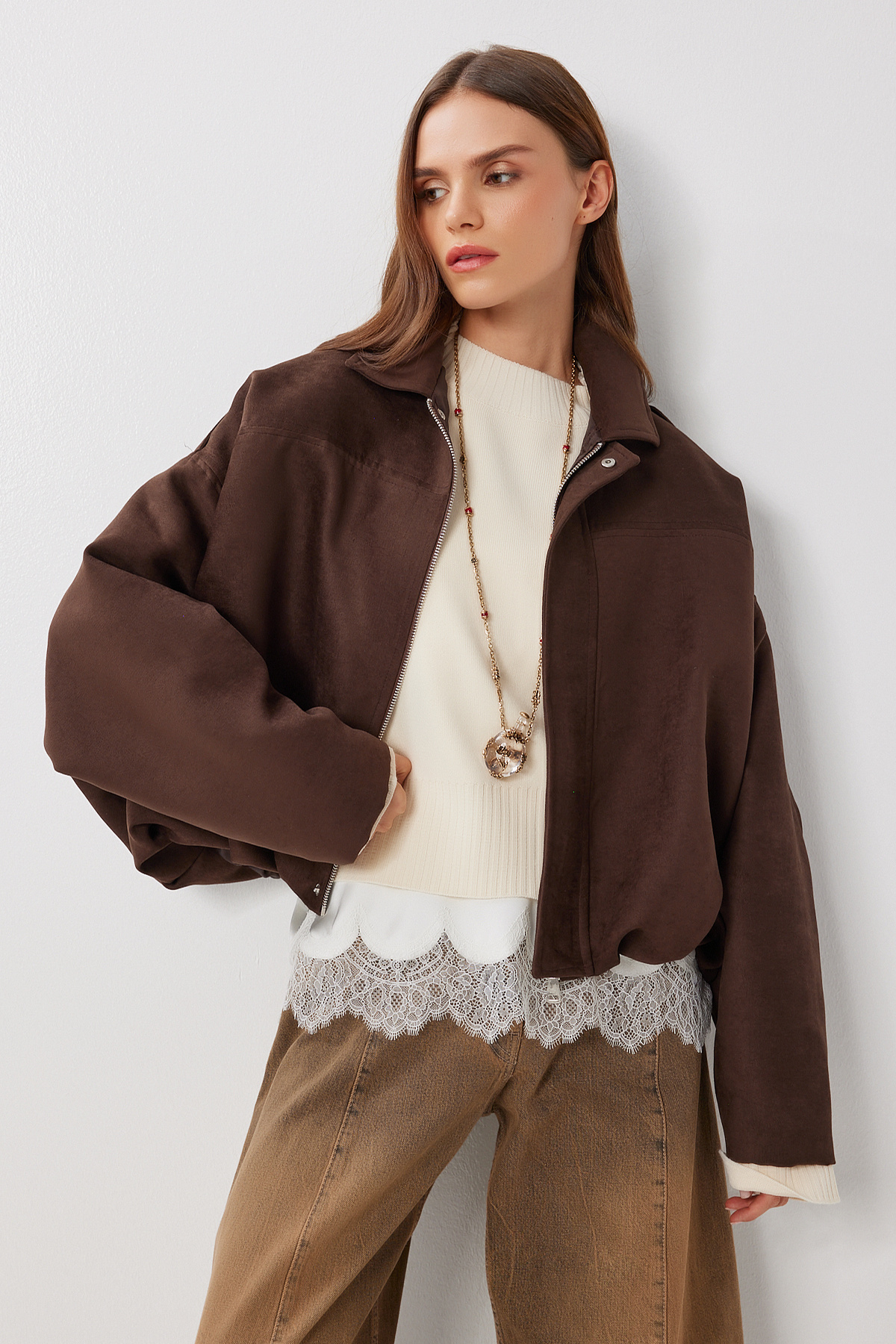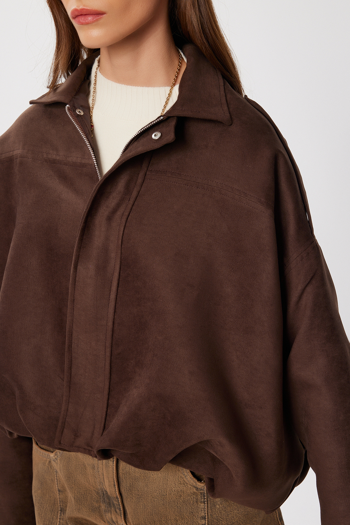 Polo yaka,fermuar ve gizli çıt çıt düğme kapamalı, düşük omuzlu, astarlı,omuzları apoletli, süet görünümlü bomber ceketİçerik: %100 PolyesterÜrün Boyu: 55 cm Kol Boyu: 47 cmYıkamayınız.
