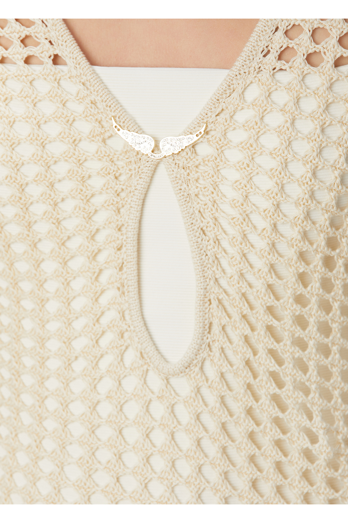 V yaka, taşlı logolu, uzun kollu, mini kroşe elbise Ürün bedeni: S / Model ölçüsü: Boy: 179 cm - Göğüs: 81 cm - Bel: 59 cm - Kalça: 88 cm Yeni sezon hazır giyim alışverişlerinizde ücretsiz tadilat yapılmaktadır