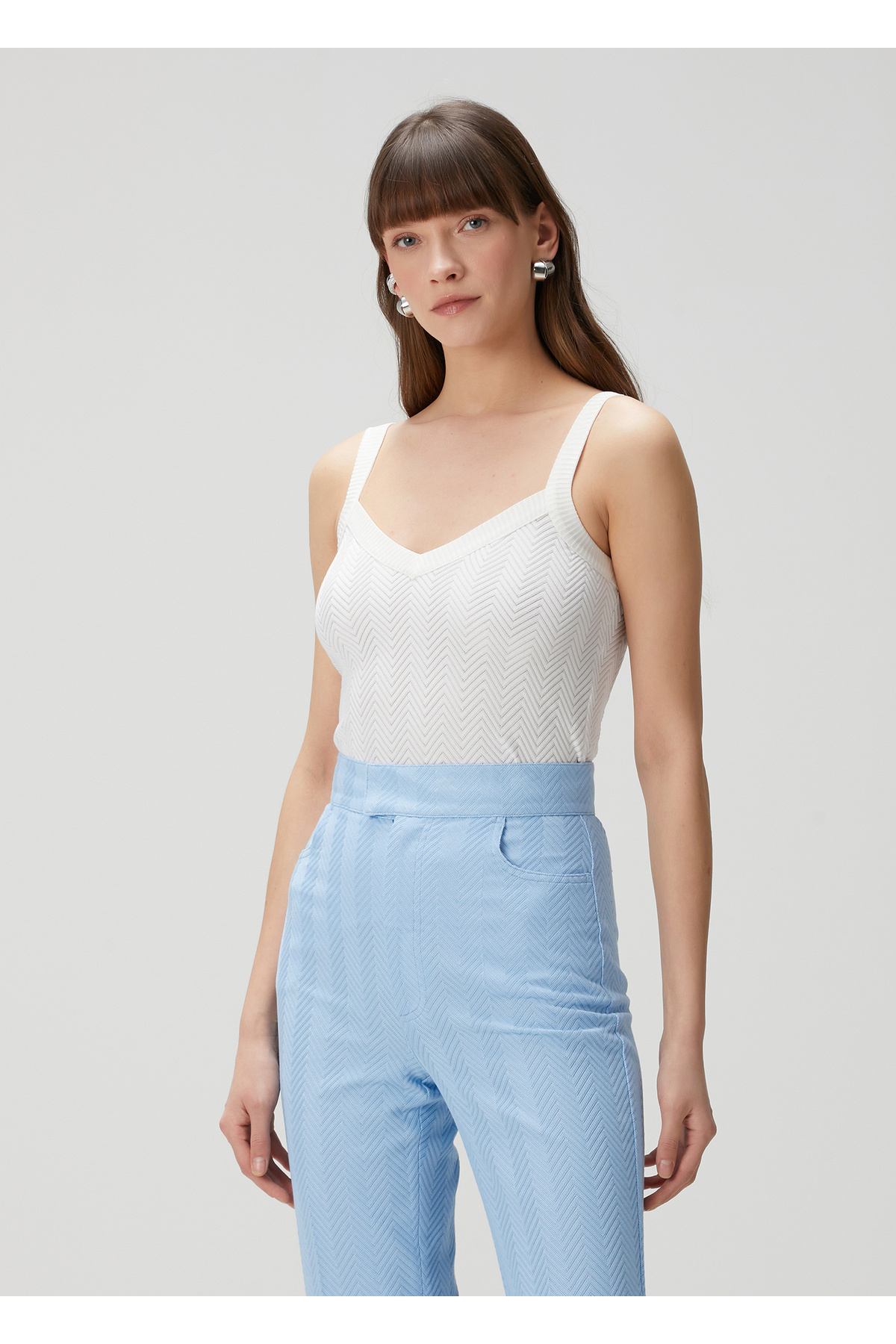 V yaka, askılı, zikzak desenli atlet Ürün bedeni: 38 / Model ölçüsü: Boy: 178 cm - Göğüs: 85 cm - Bel: 60 cm - Kalça: 89 cm Yeni sezon hazır giyim alışverişlerinizde ücretsiz tadilat yapılmaktadır