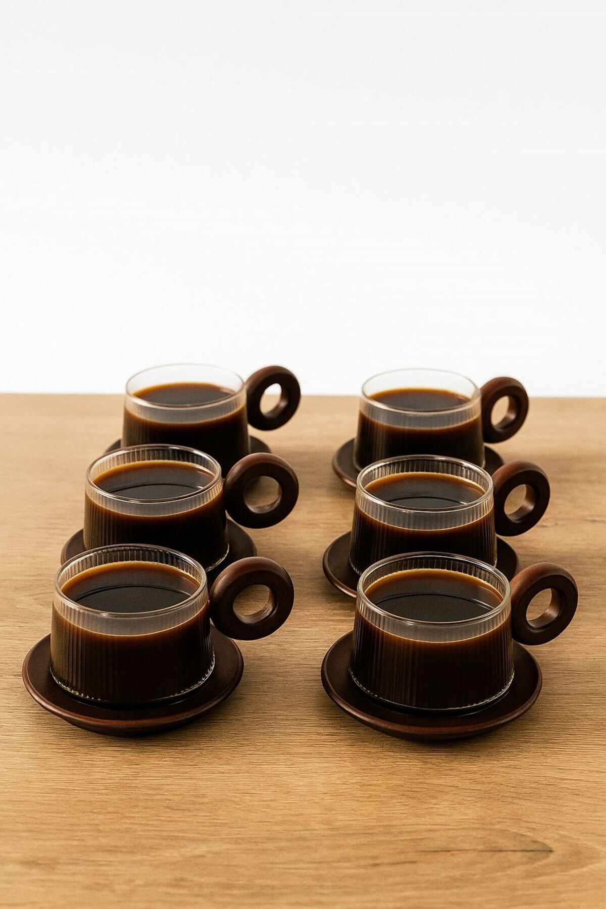 Borosilikat Cam Akasya Saplı Çizgili Tasarmlı ve Akasya Tabaklı Çay Kahve Fincanı 6'lı 250 ml