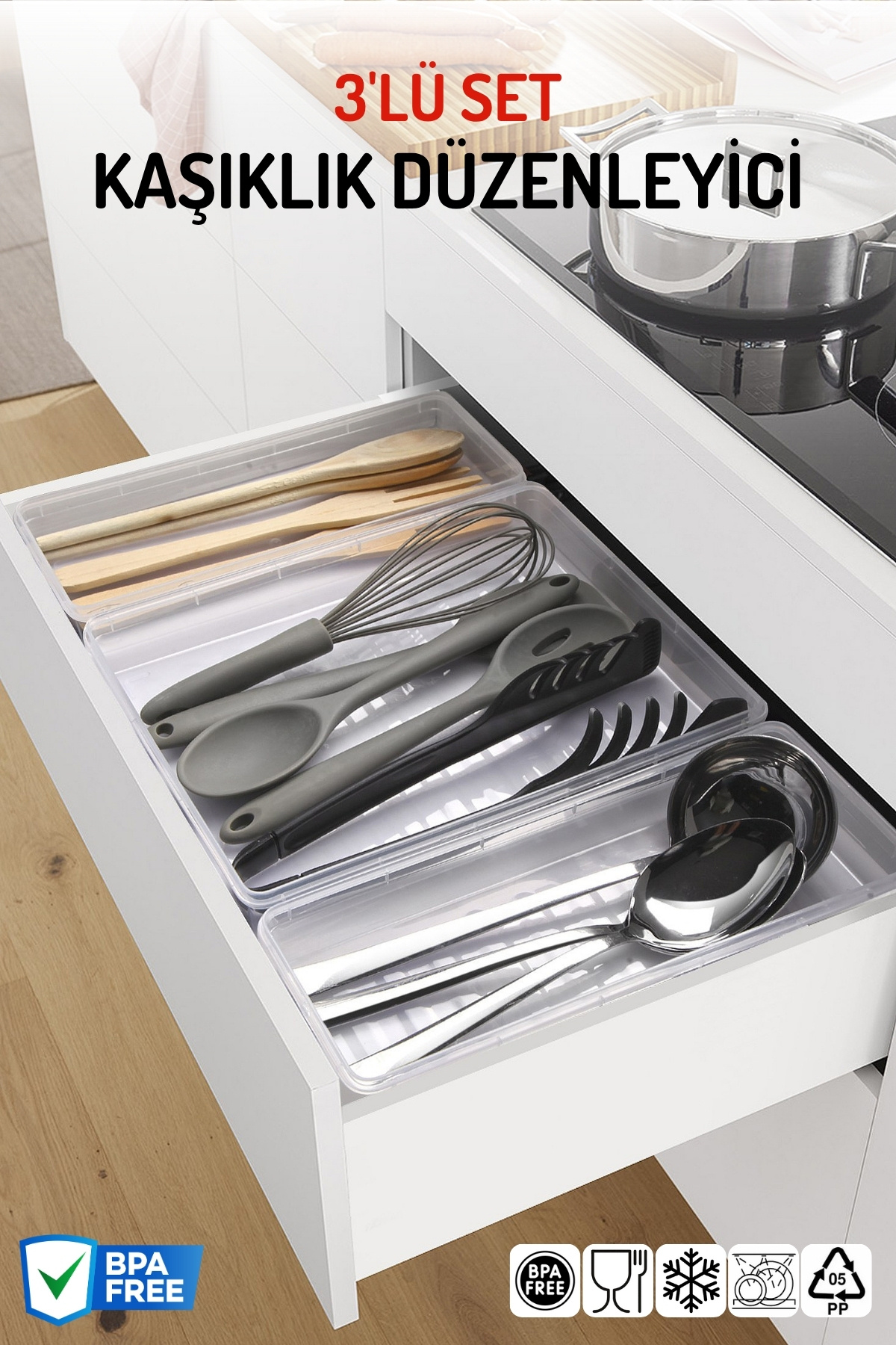Çekmece içi düzenleyici sayesinde mutfak gereçlerinizi düzenli ve kolay erişilebilir şekilde saklamanızı sağlar