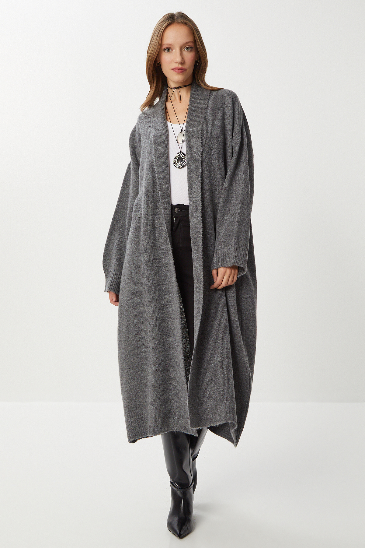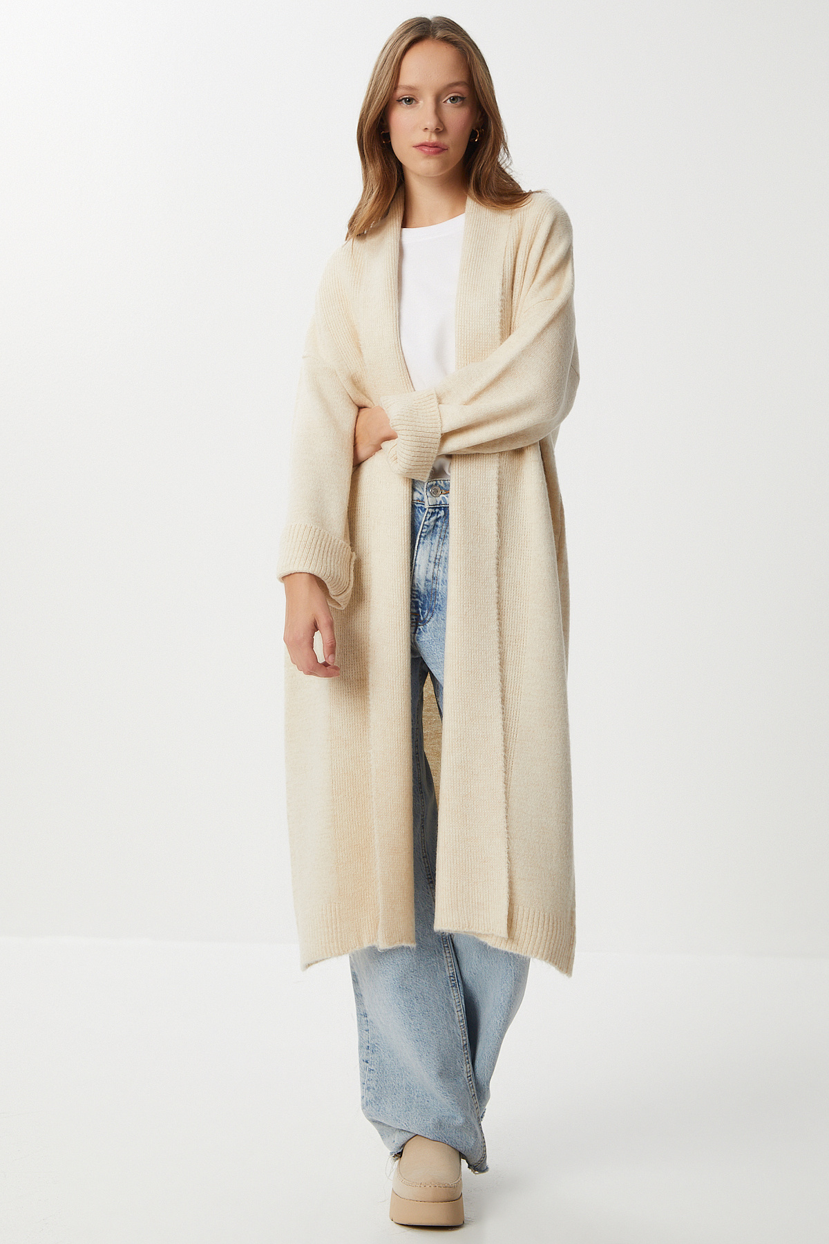 Şal yaka, düşük omuzlu, likralı, salaş, uzun triko hırkaİçerik: %100 AKRİLİKÜrün Boyu: 120 Cm Kol Boyu: 75 Cm30° makinede yıkanabilir.
