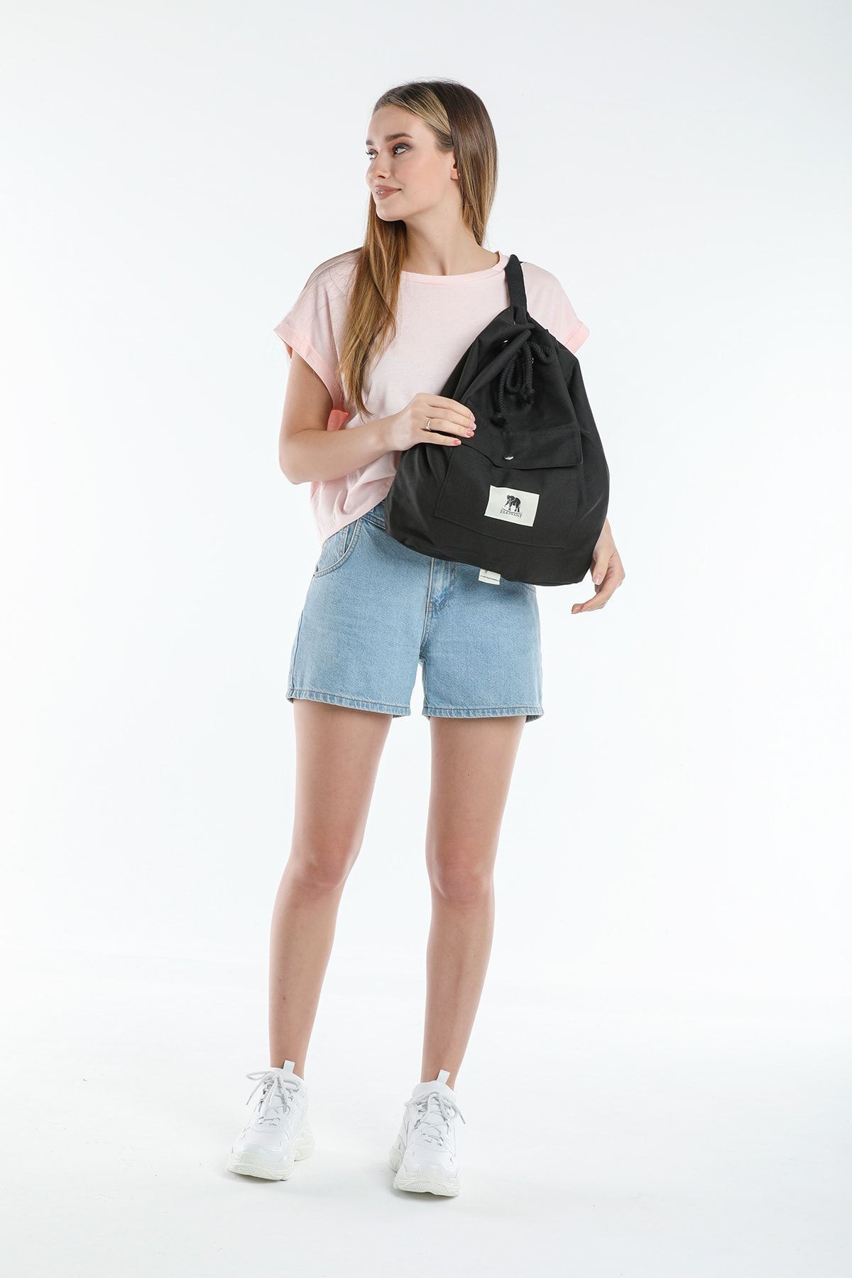 Ağzı ip büzgülü kanvas siyah cepli sırt çantası