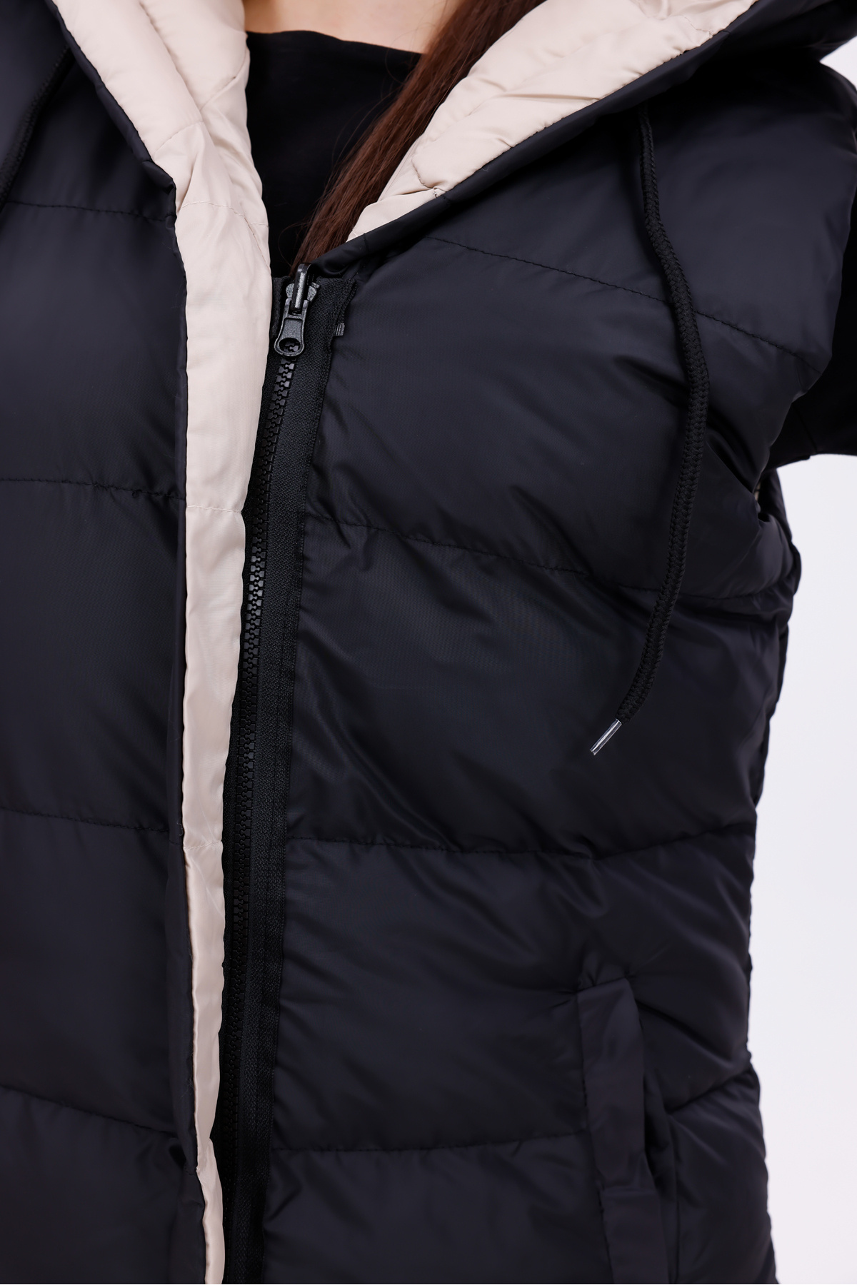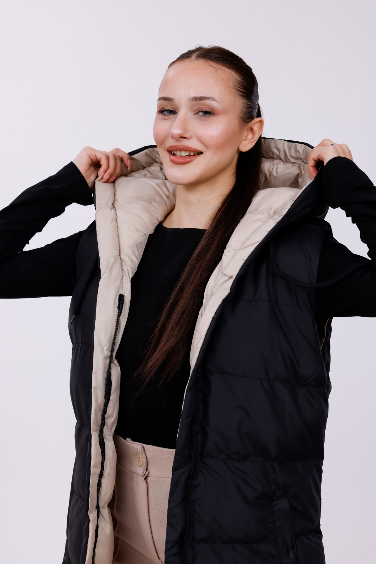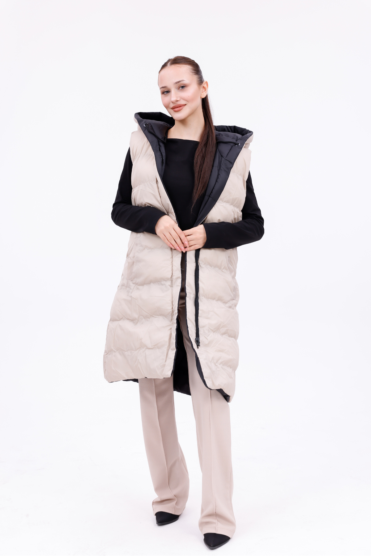 Çift Taraflı Kapüşonlu Uzun Şişme Yelek Siyah Bej