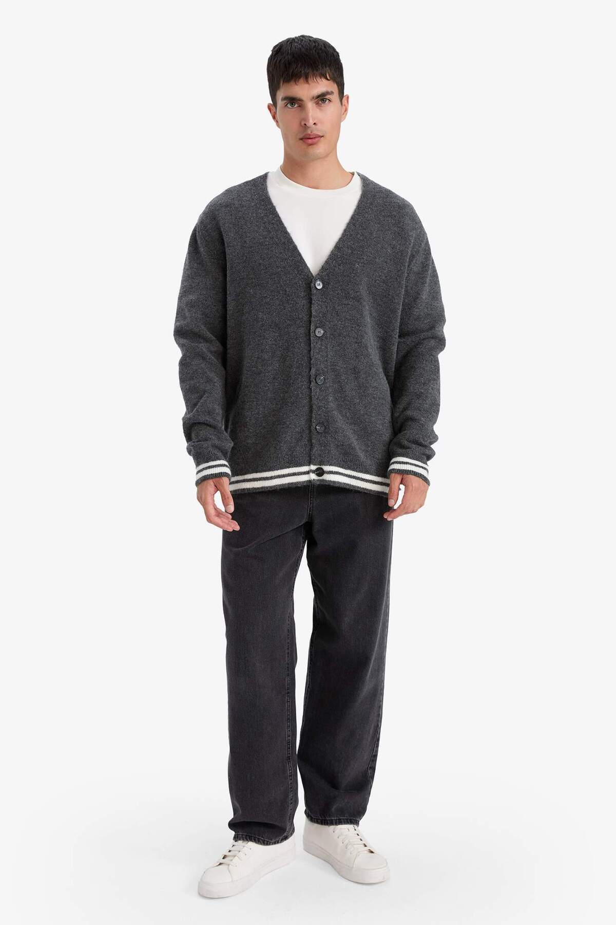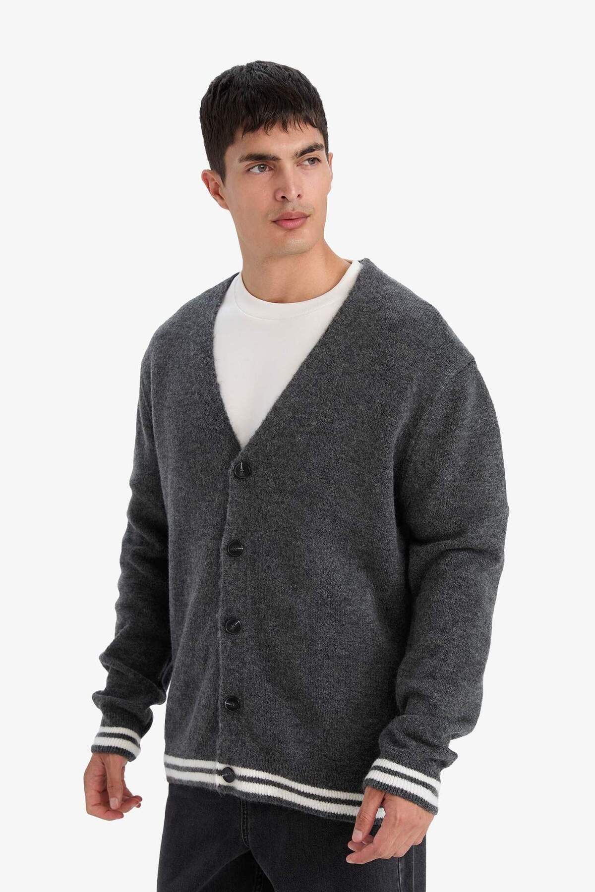 Relax fit kesimi ve klasik V yaka tasarımıyla öne çıkan triko hırka, konforlu ve şık bir stil sunar.