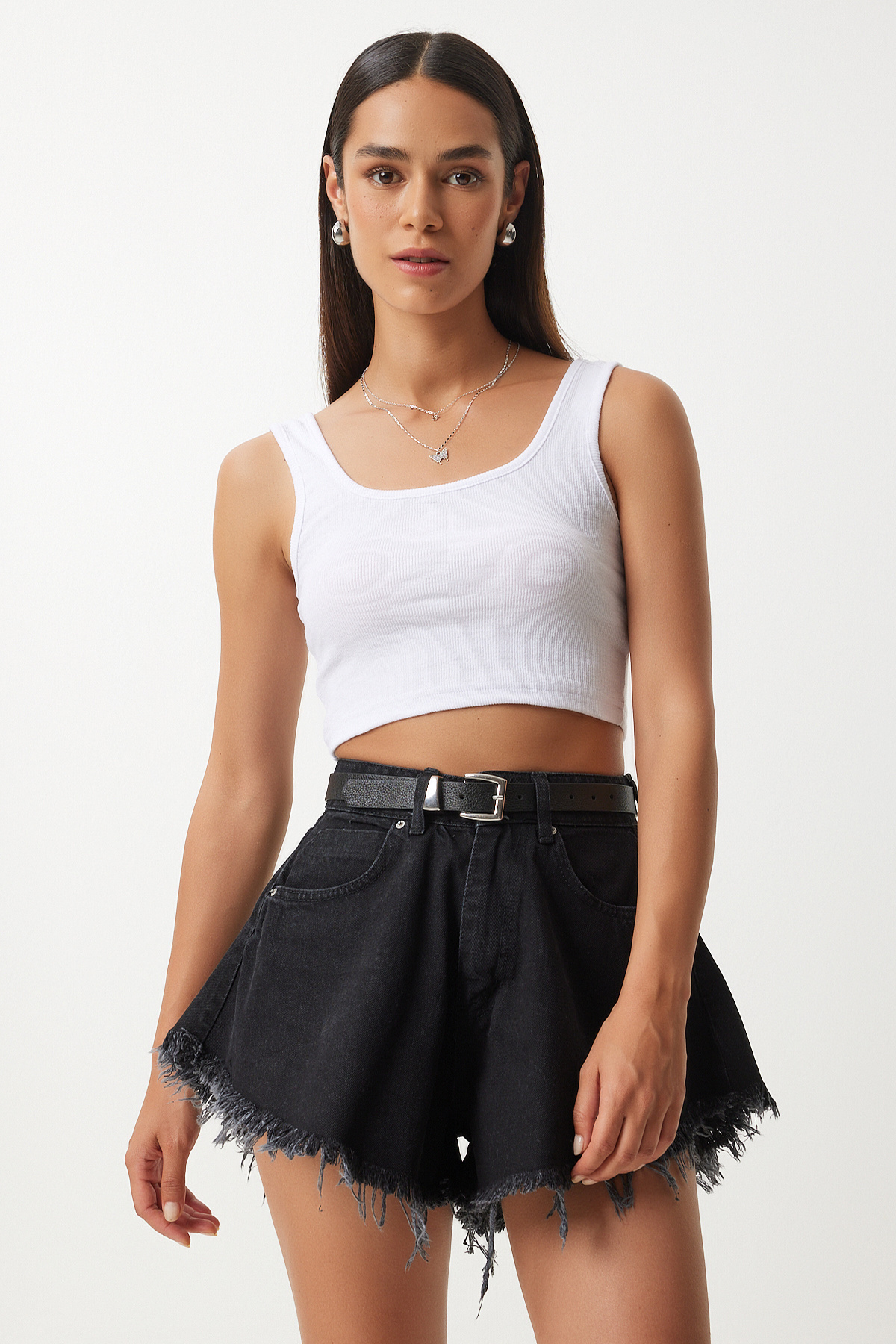 Askılı Crop 2'li Paket Örme Bluz HGT0001 SİYAH BEYAZ