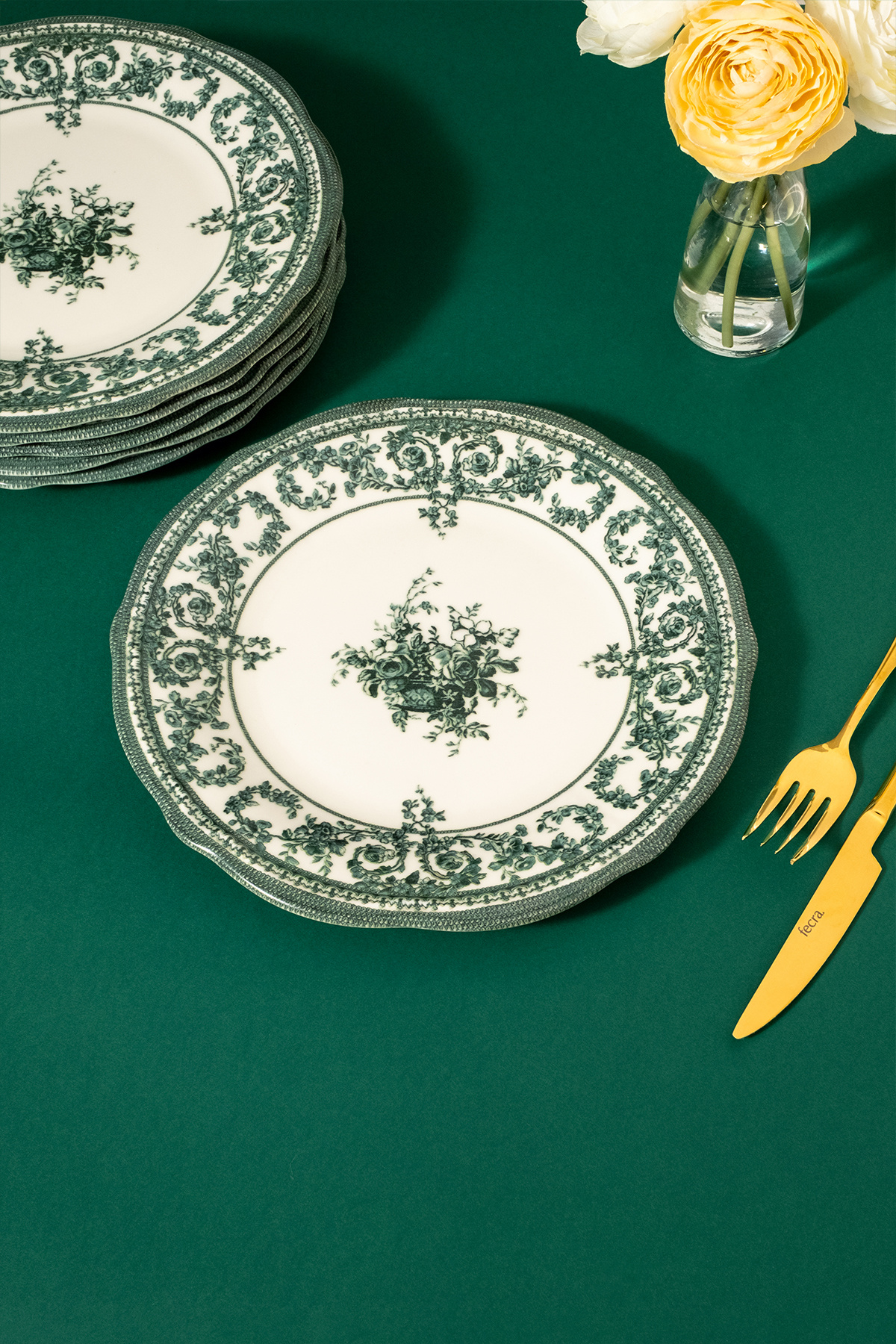 Fecra Majestic Green Koleksiyonu, doğanın dingin yeşil tonlarını klasik porselen sanatının zarafetiyle bir araya getiriyor. İnce desenleri, tıpkı bir bahçedeki zarif sarmaşıklar gibi tabağın kenarlarında dans ediyor.