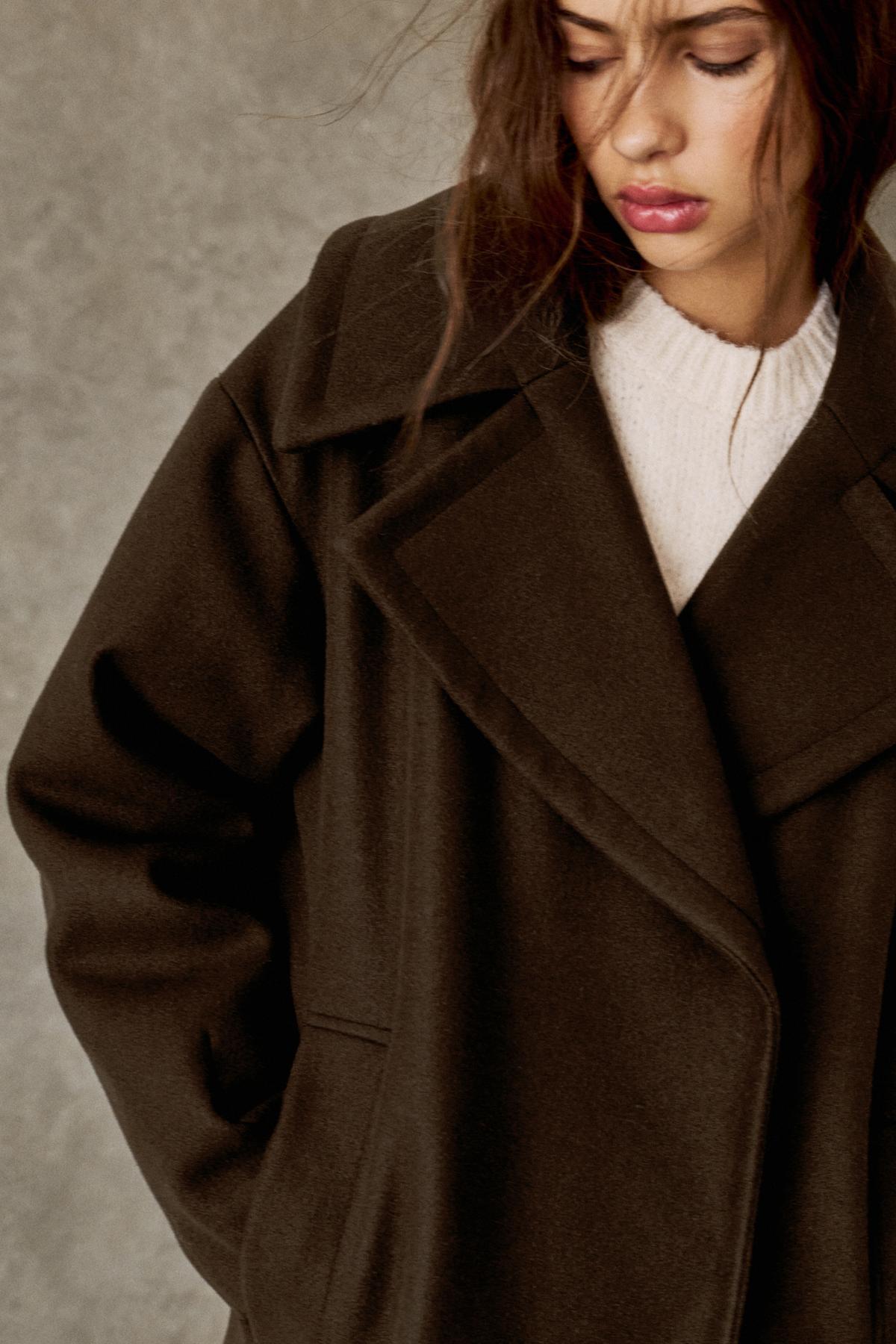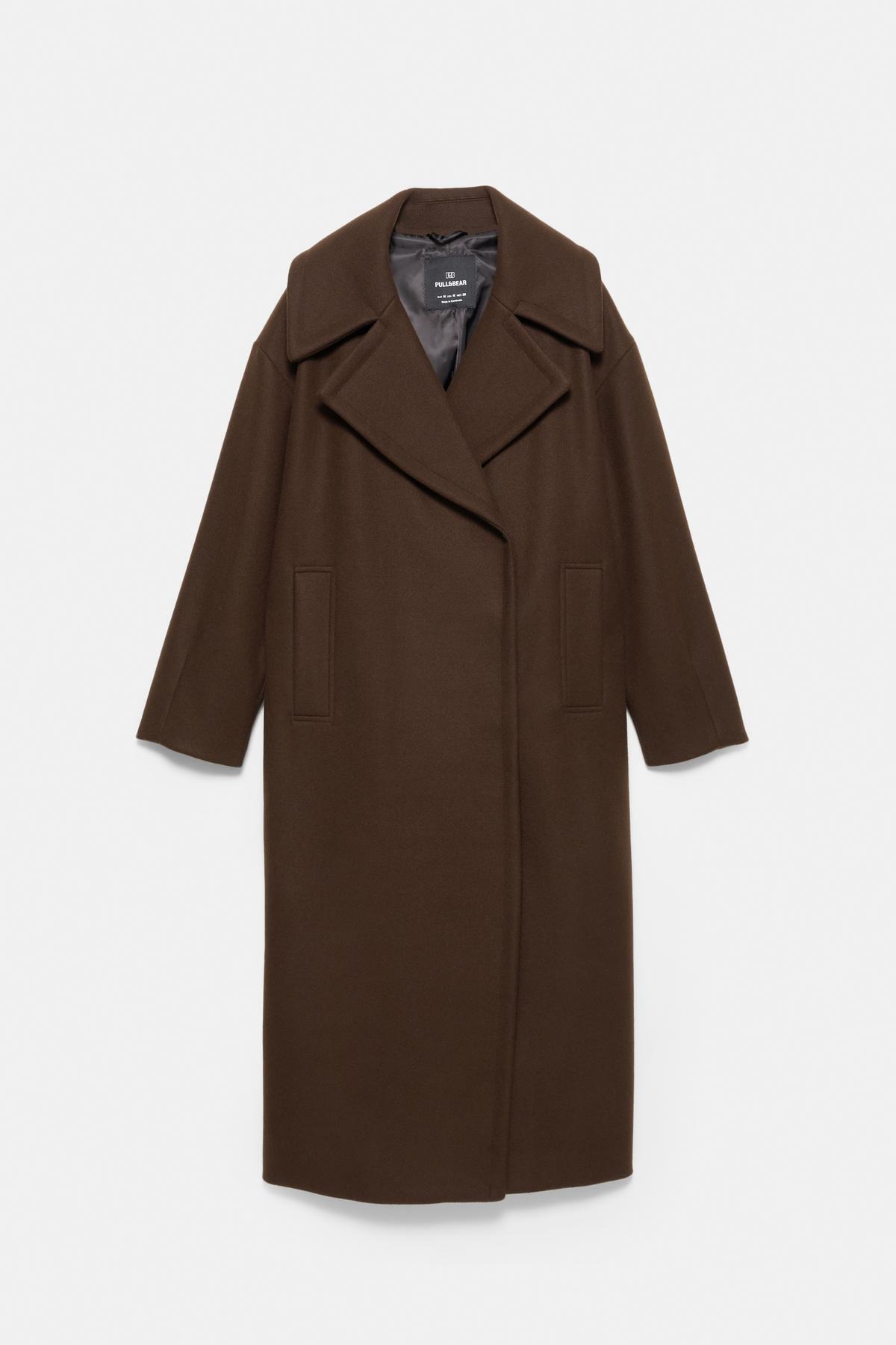 Geniş yakalı, cepli ve uzun kollu, yumuşak kumaş uzun kaban.