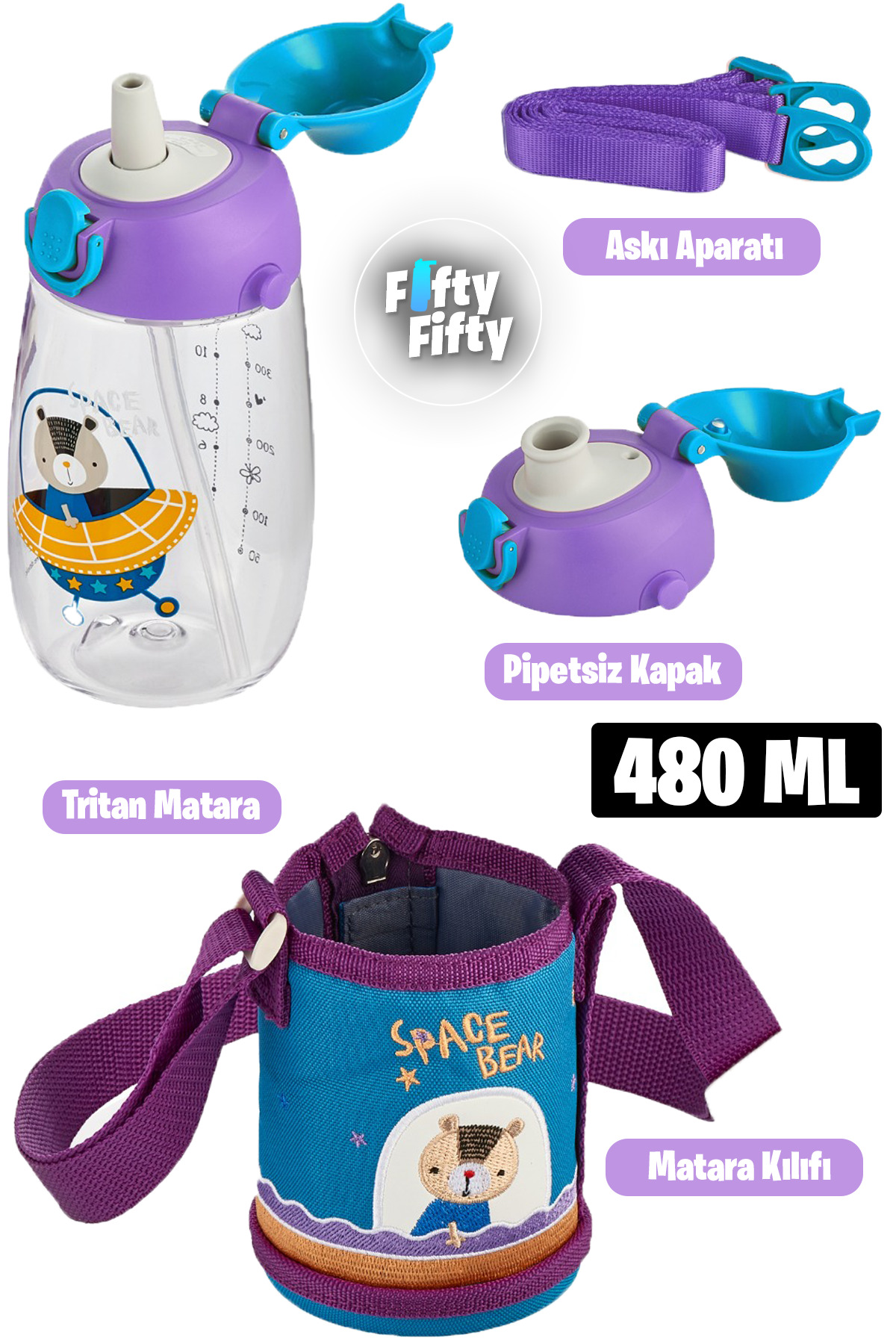 FiftyFifty siz değerli müşterilerimiz için Uzspace 480ml Özel Koruma Kılıflı İki Ayrı Kapaklı Pipetli/Pipetsiz Askı AparatlıTritan Bpa İçermeyen Çocuk Su Matarasıyla buluşturuyor