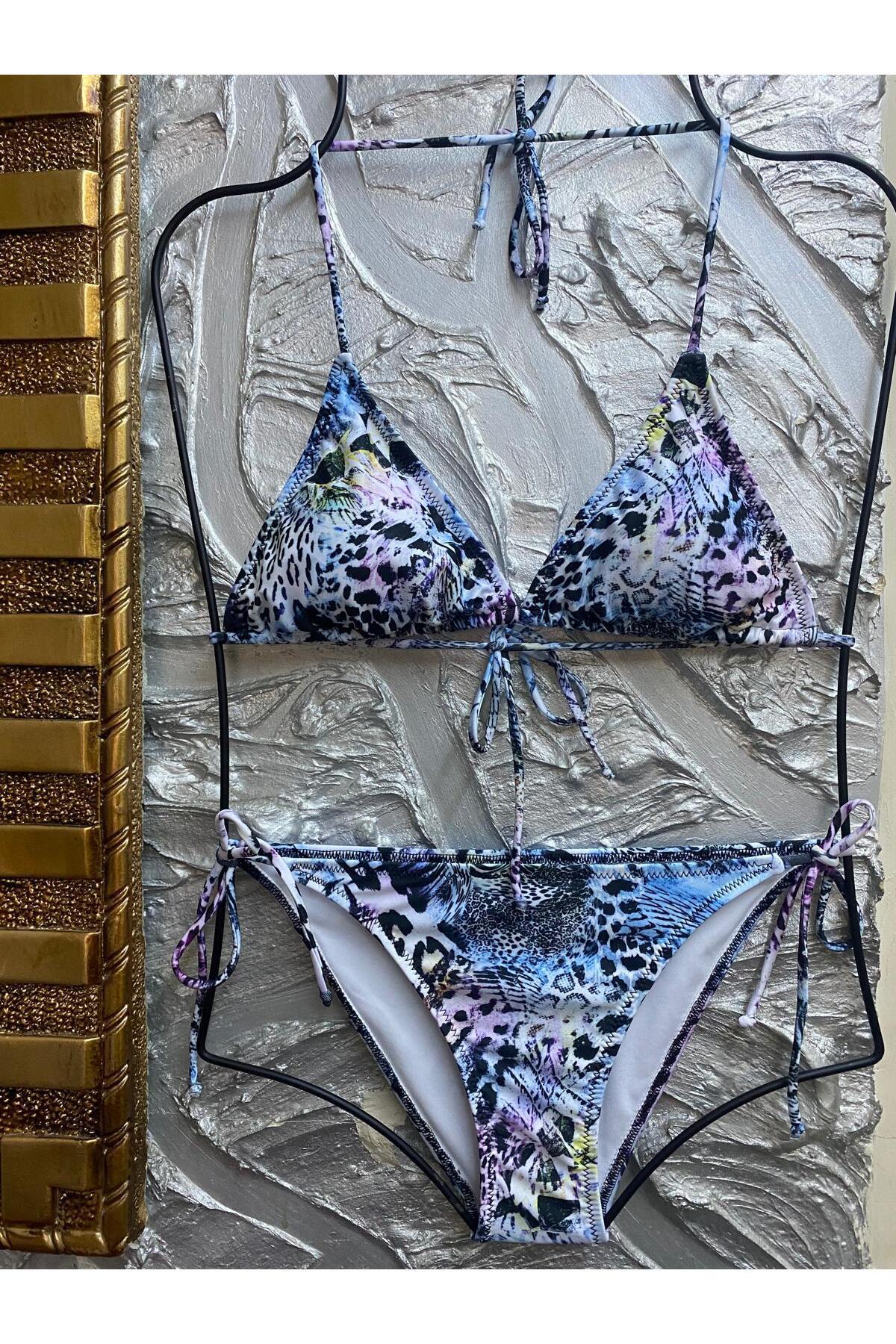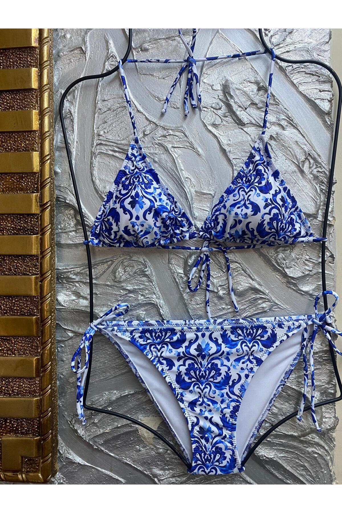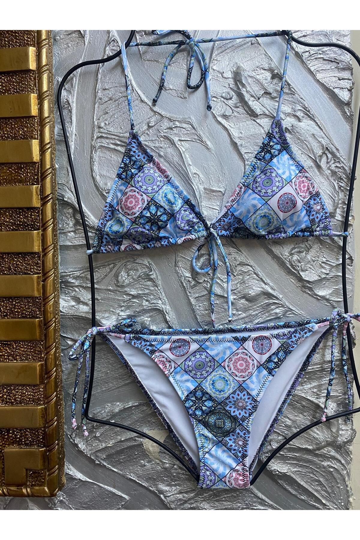- Çini deseniyle göz alıcı bir görünüm sunan üçgen bikini takımı, plaj modasına şıklık katıyor.