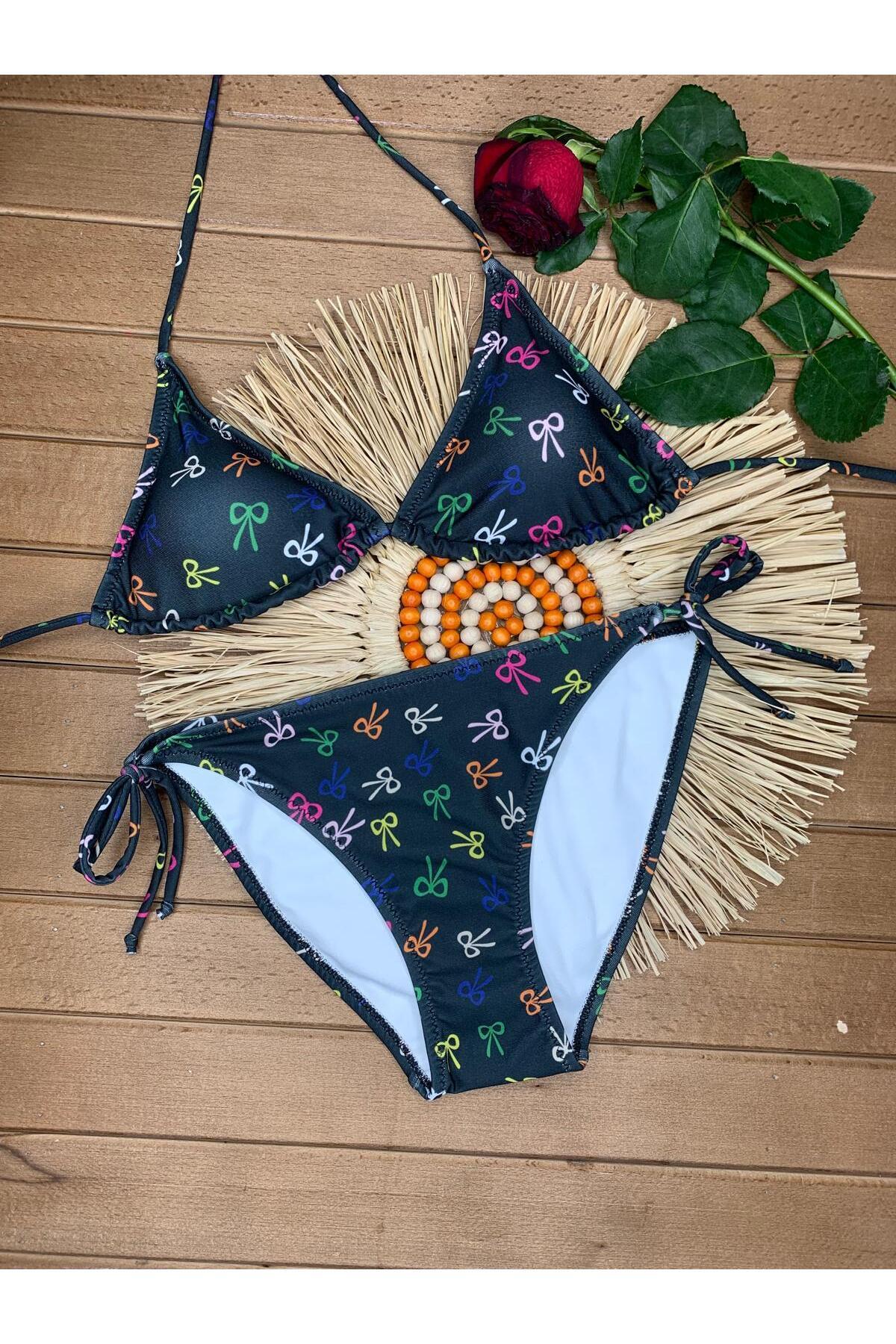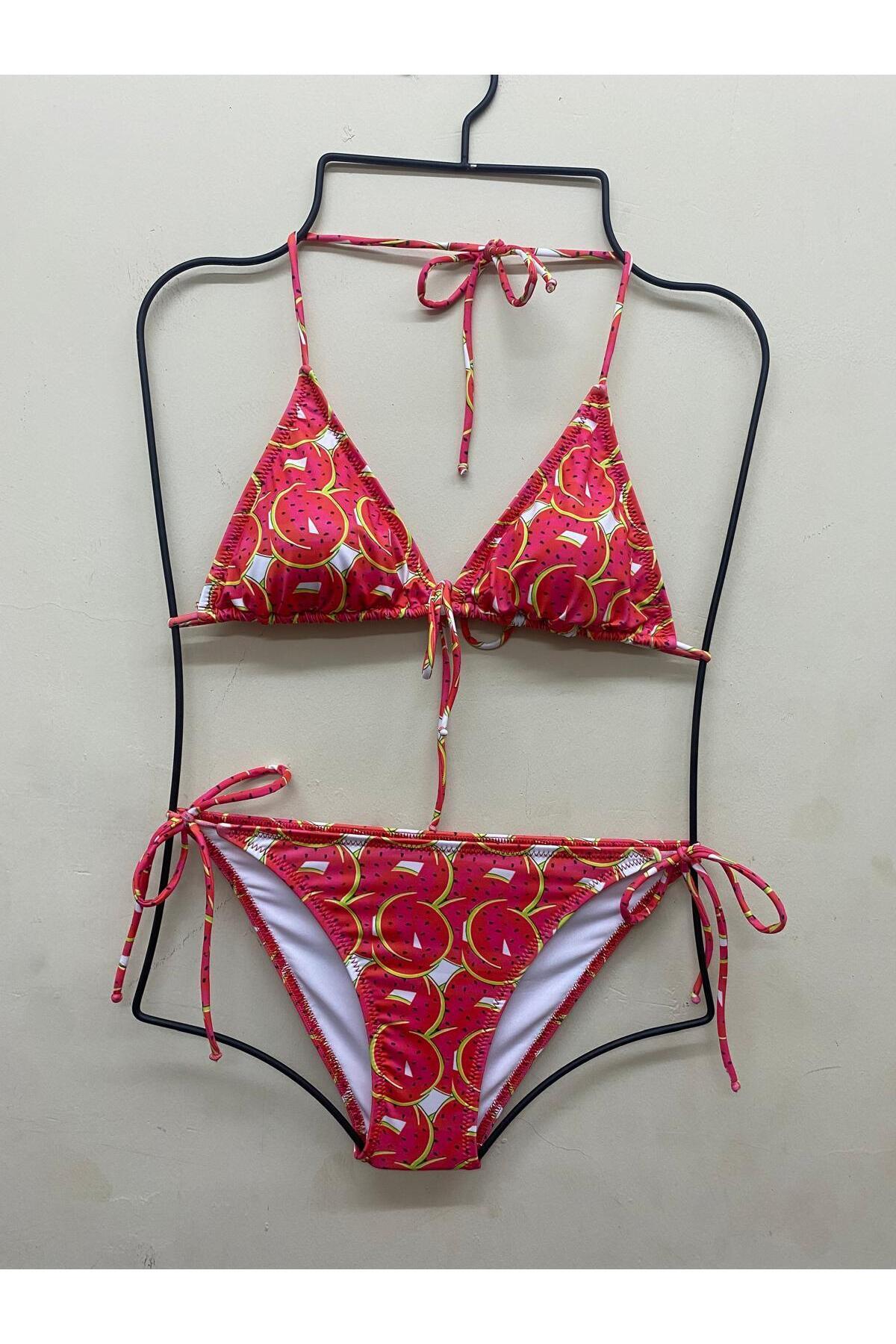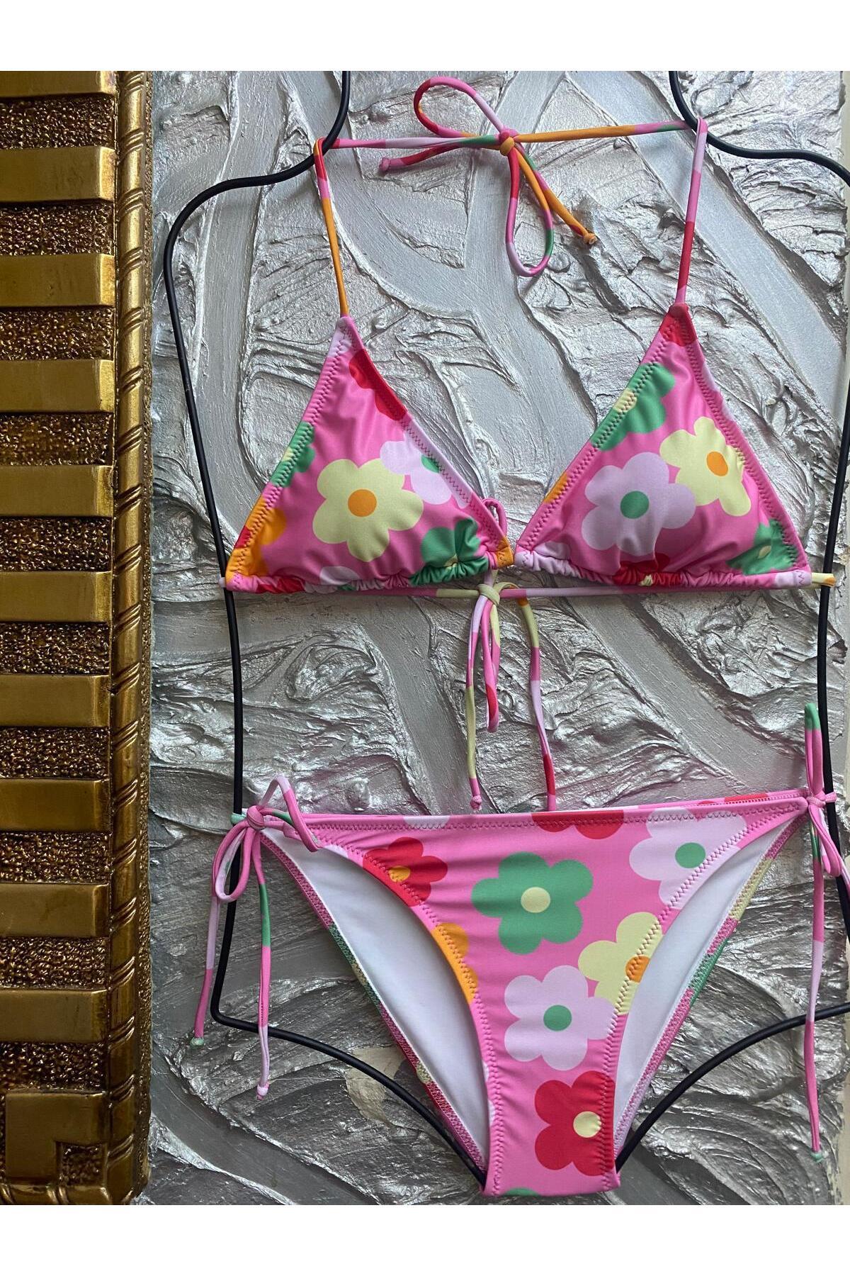 - Çini deseniyle göz alıcı bir görünüm sunan üçgen bikini takımı, plaj modasına şıklık katıyor.