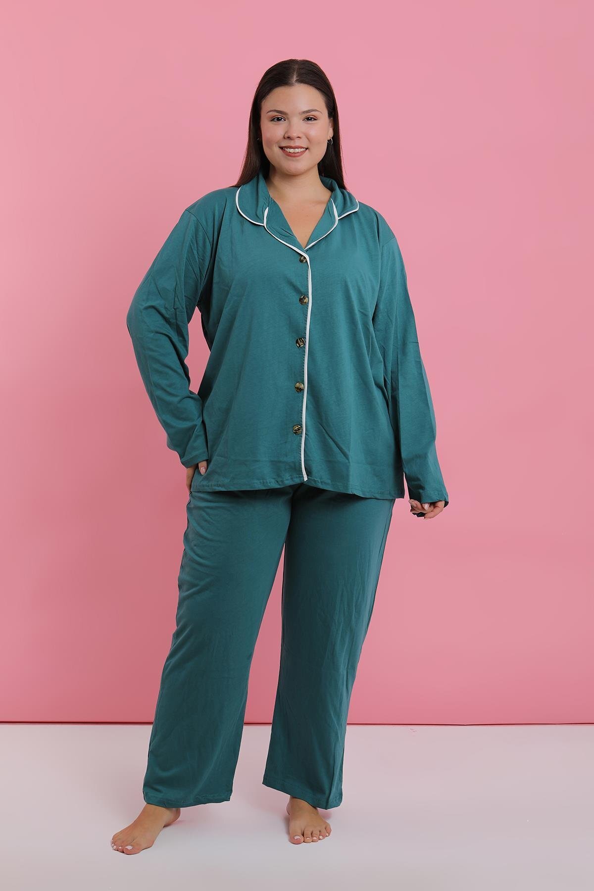 Kadın Büyük Beden Petrol Rengi Düğmeli Pijama Takımı