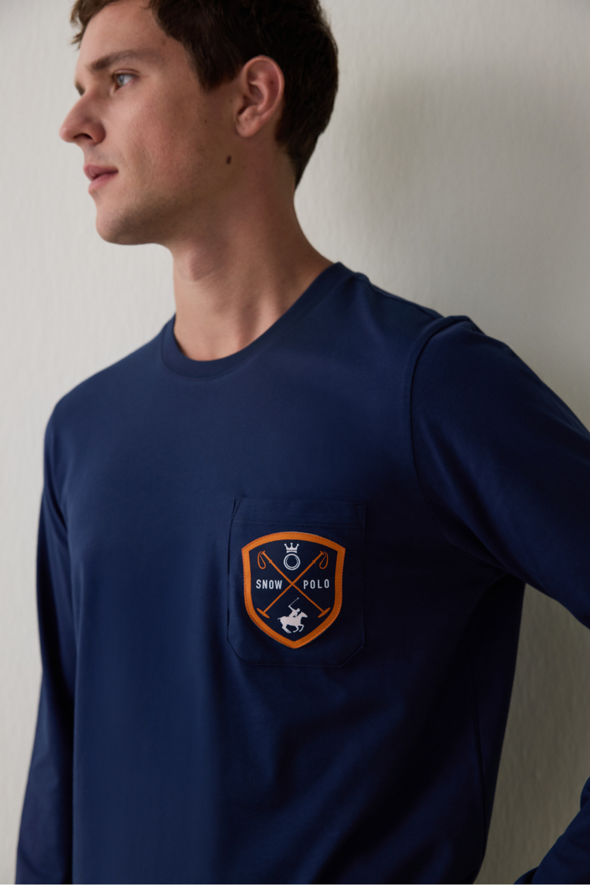 Lacivert renkli pantolona sahip bu pijama setinin, uzun kollu üst kısmı, serin akşamlarda seni sıcak tutar.