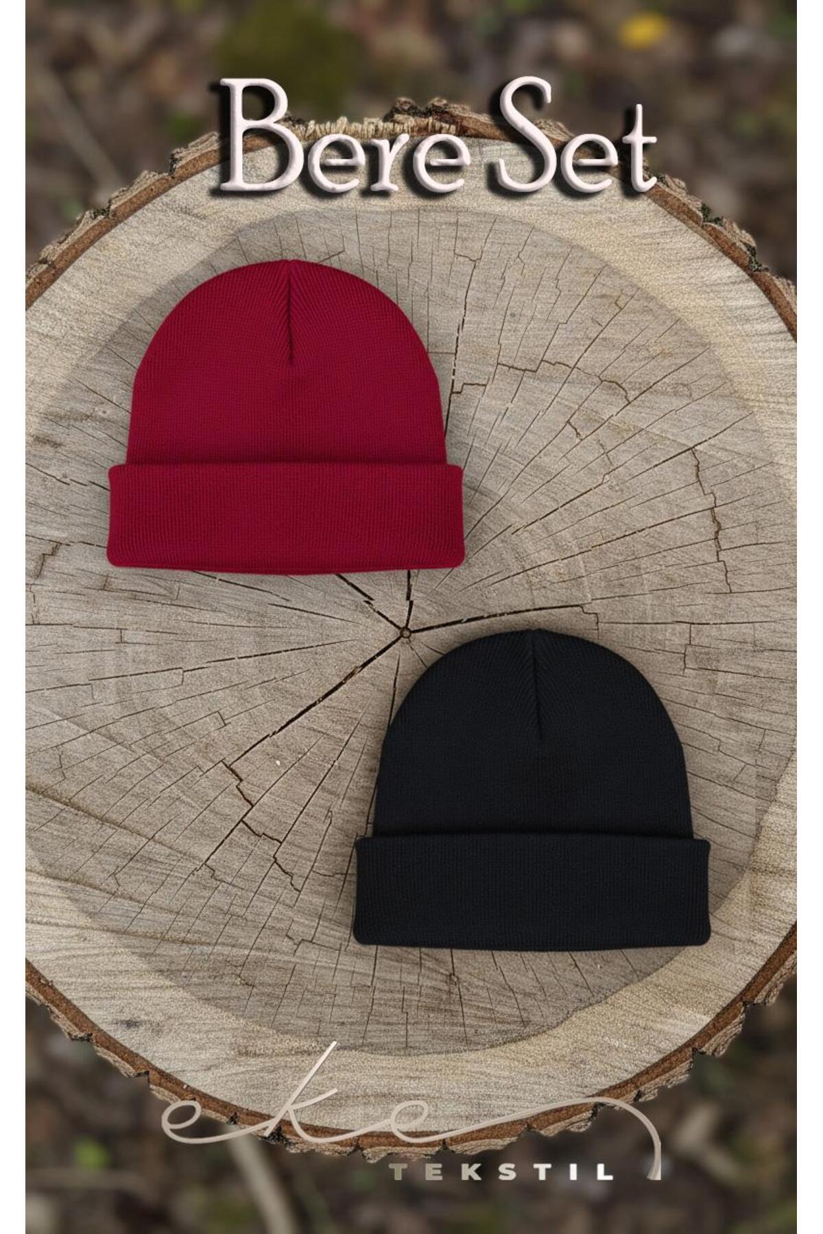 Unisex Katlamalı Siyah,Kırmızı 2'Lİ Bere Seti EKEBERESETİ2LİYENİ