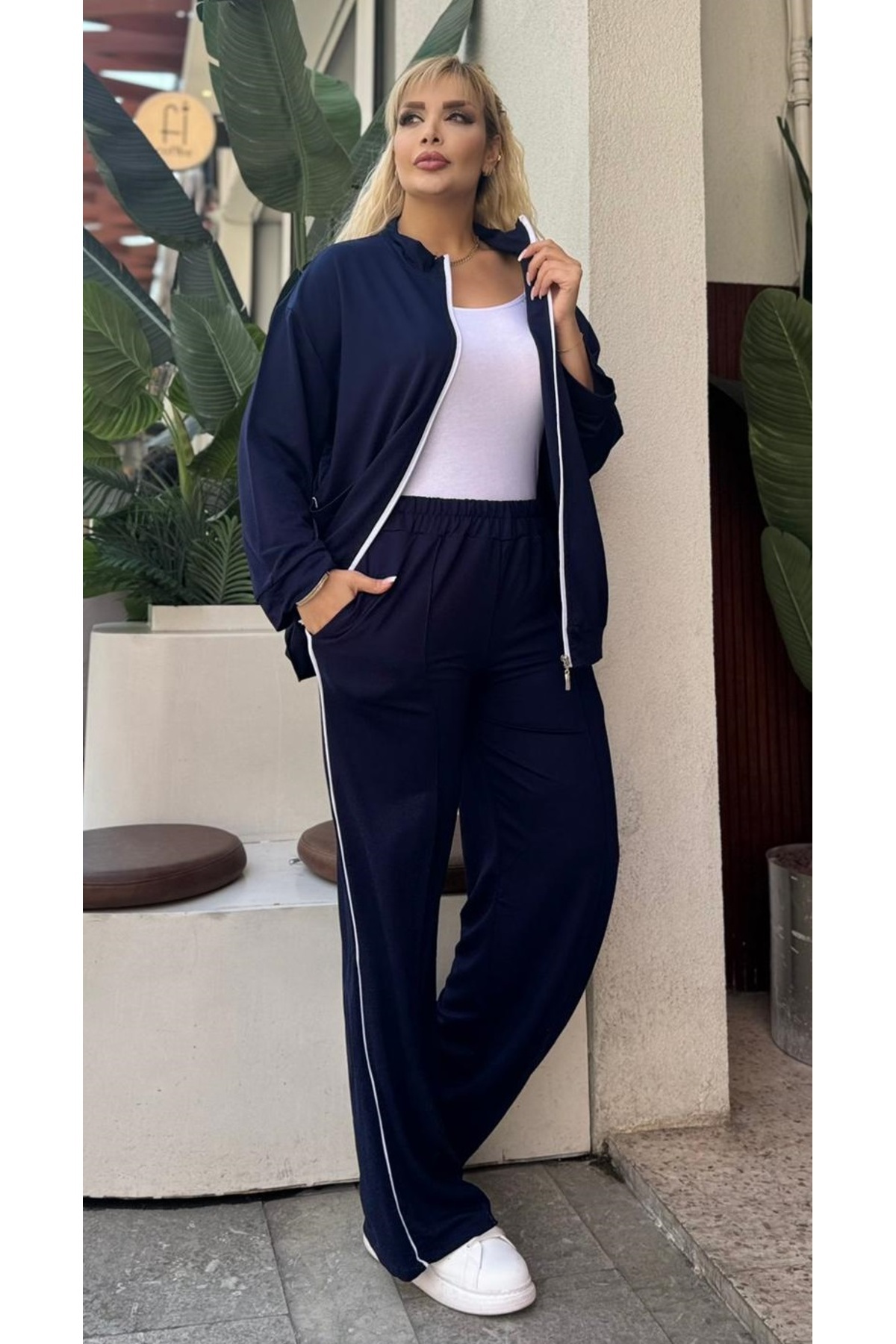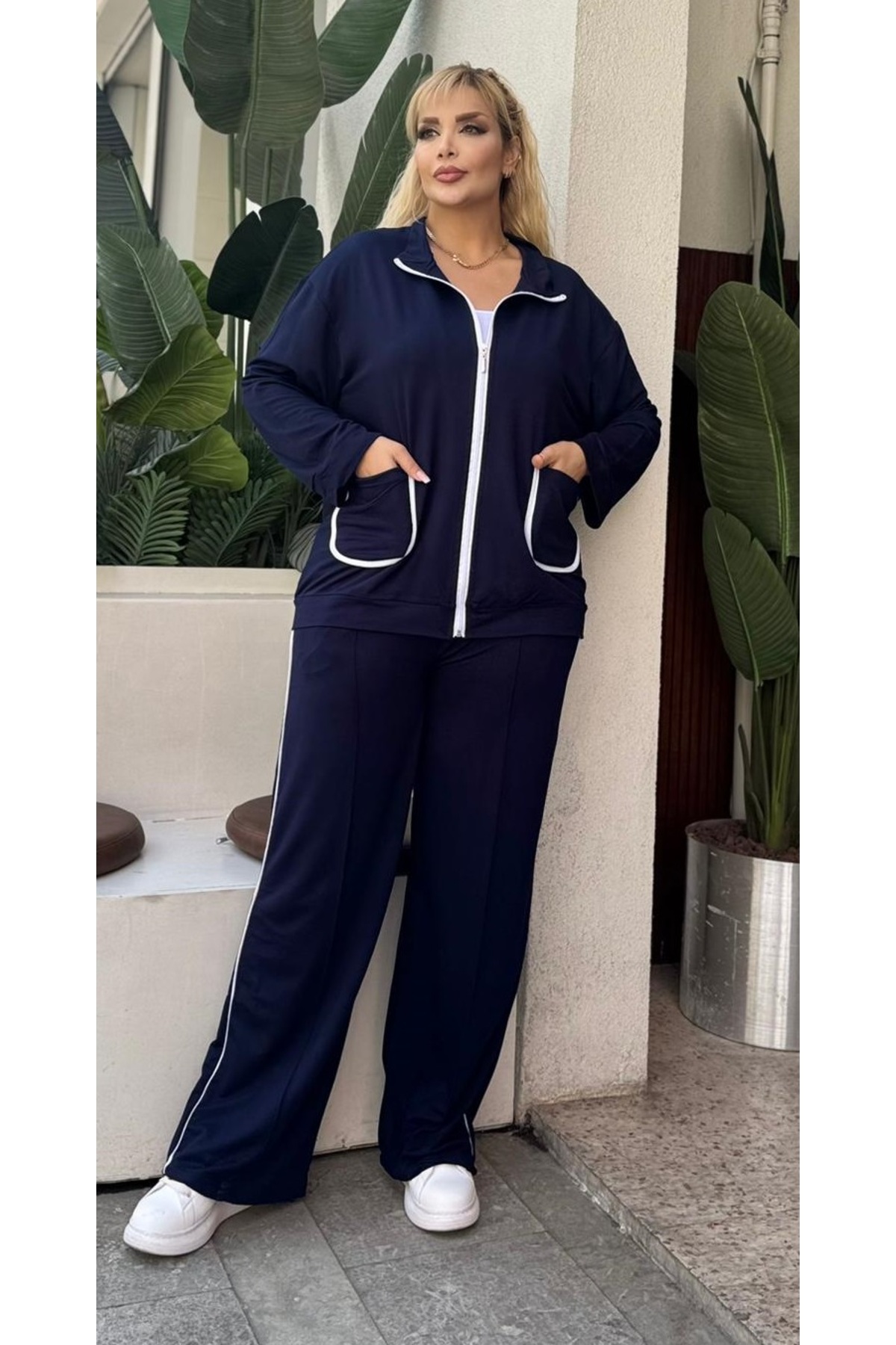 Kadın Büyük Beden Beyaz Biye Detaylı Esnek Hırkalı Eşofman Altı Takımı 25051