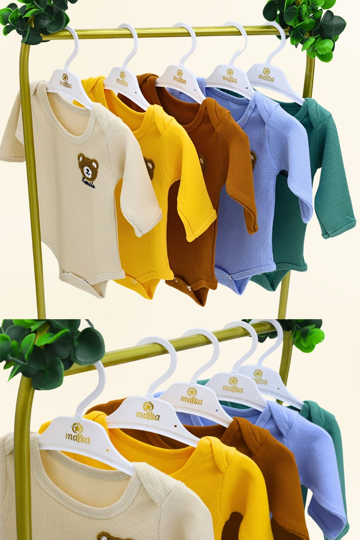 Bebeğinizin stilini tamamlayacak, kaliteli ve şık bir seçenek arıyorsanız, 5'li Renkli Bebek uzun kollu Body Seti tam da ihtiyacınız olan ürün ! %100 Organik Pamuk Waffle Kumaş