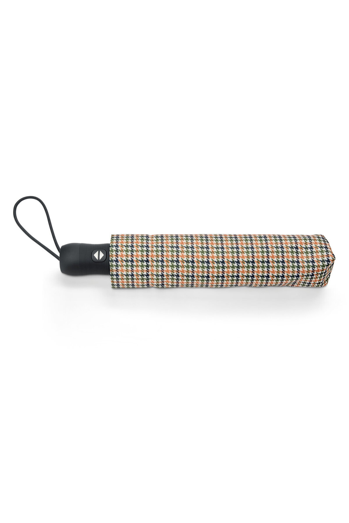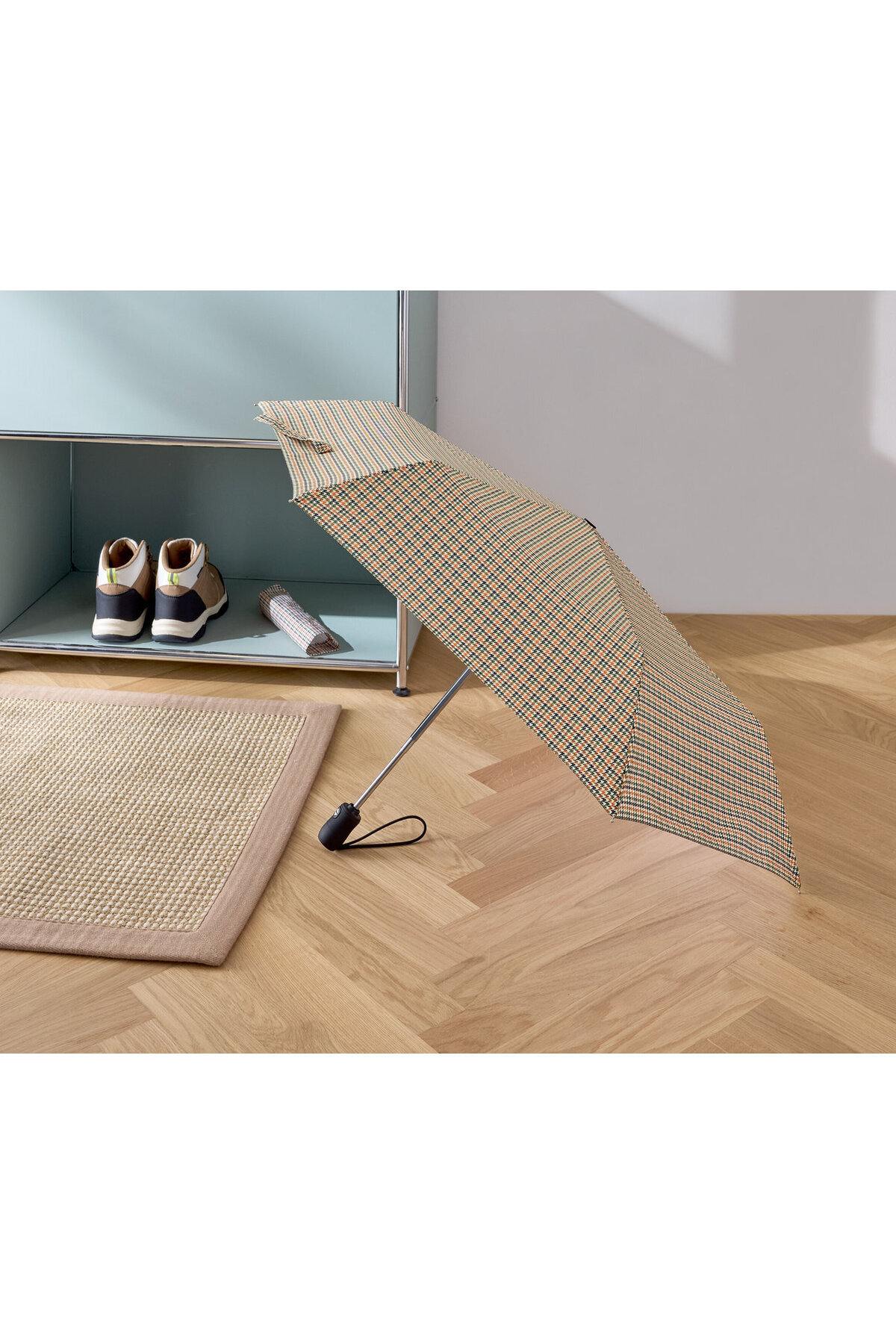 Su itici etkili su tutmayan apre Kompakt cep formatında şemsiye Tek düğmeyle açılır ve kapanır Elastik taşıma askılı Soft Touch tutacak Modern kazayağı desenli Su ve kir tutmayan üst yüzey Sağlam alüminyum iskelet Bu apre sayesinde şemsiye kuru halde cebinizde taşınabilir Koruma kılıfı dahildir Zararlı madde kontrolü yapılmıştır – harici, akredite kuruluşlar tarafından İçerik Renk Lacivert-konyak rengi-yeşil-krem rengi kazayağı desen Malzeme Şemsiye ve koruma kılıfı %100 polyester İskelet alüminyum Sap plastik Ölçüler Çapı yakl.