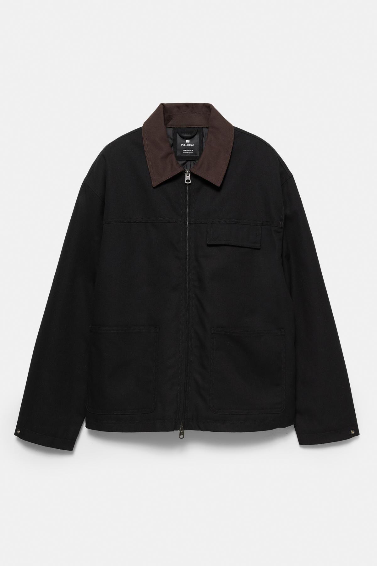 Kontrast yakalı, uzun kollu, fermuarlı ve ön cepli pamuklu ceket.