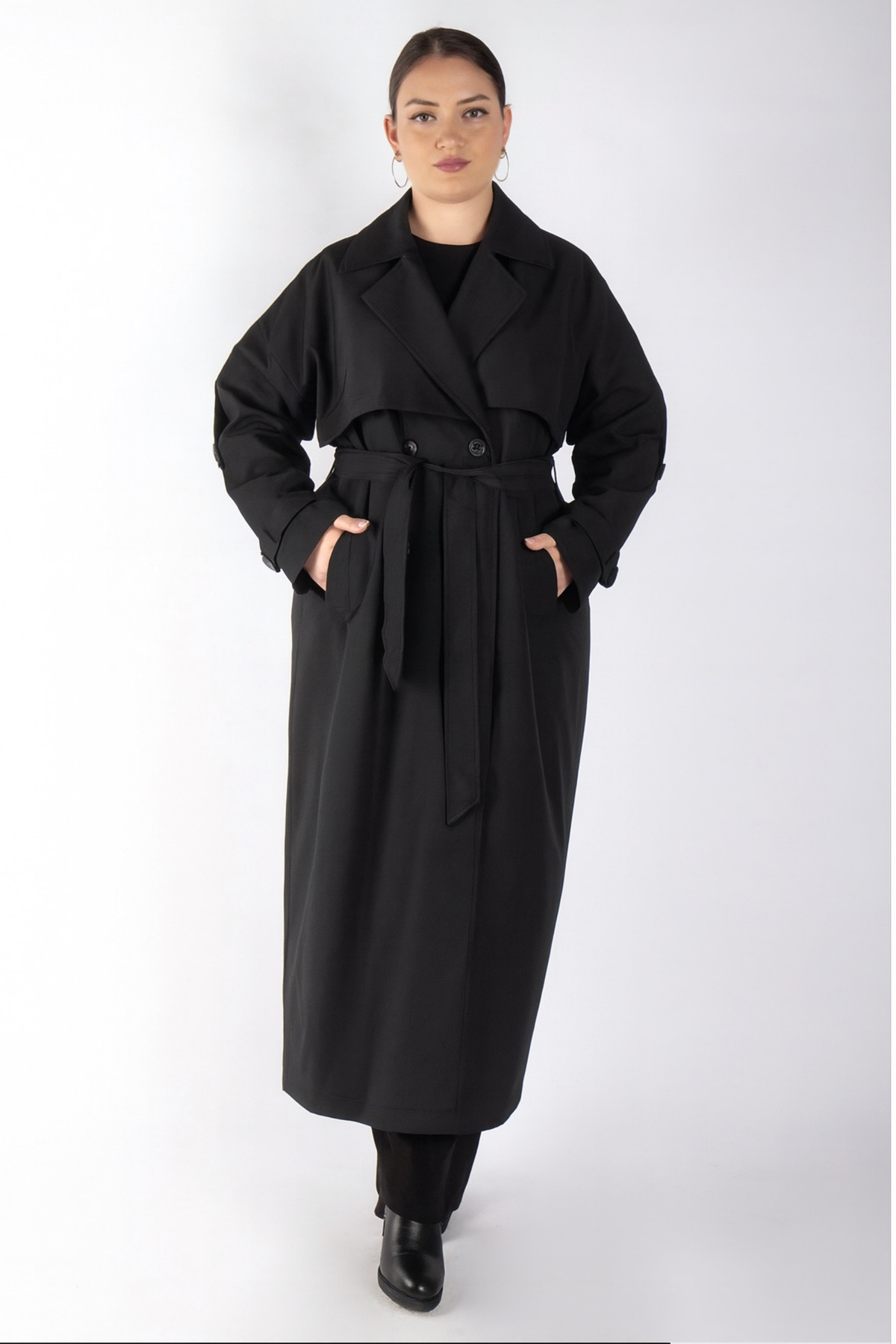 - Kruvaze yakası ile sofistike bir dokunuş katarken düğmeli kapama şekli kolay kullanım sunar.