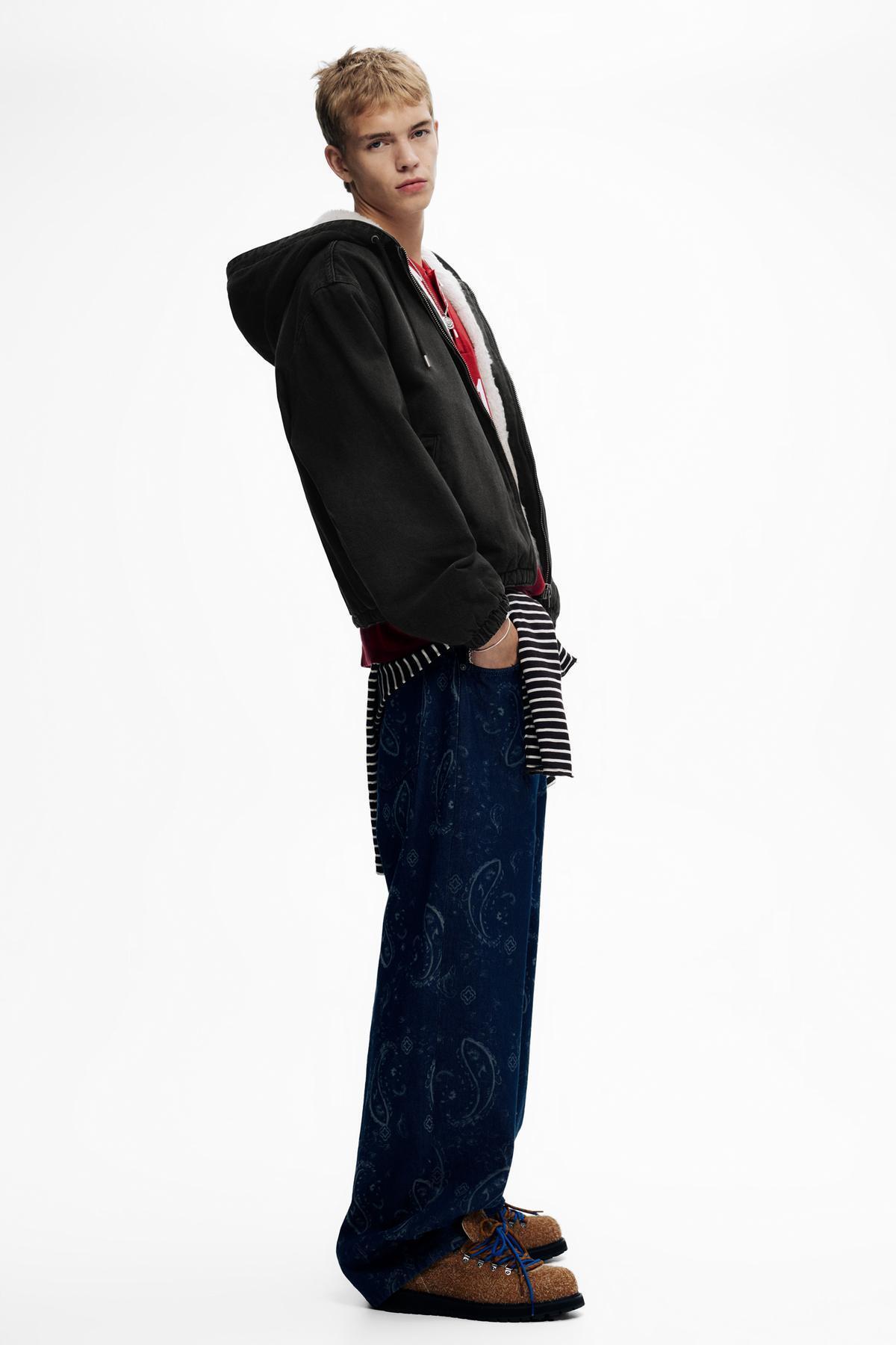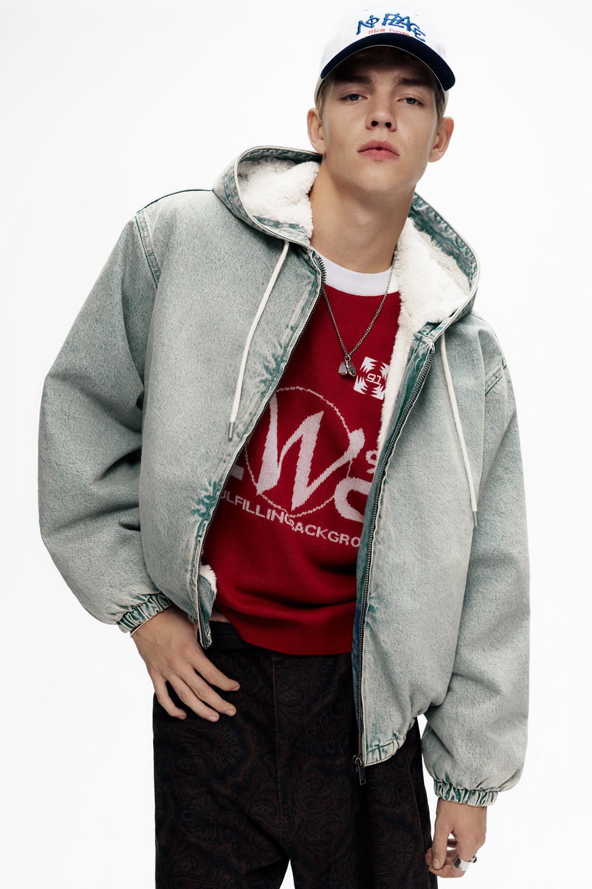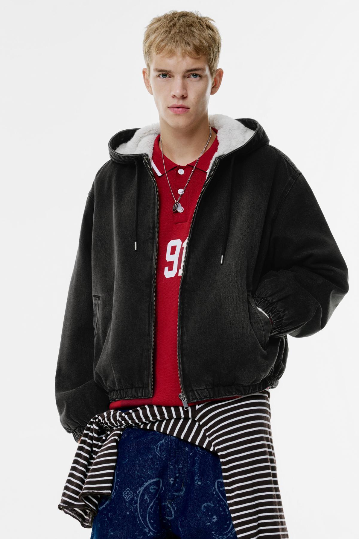Kapüşonlu, kürk iç detaylı, yan cepli ve fermuar kapamalı bomber tarzı denim ceket.
