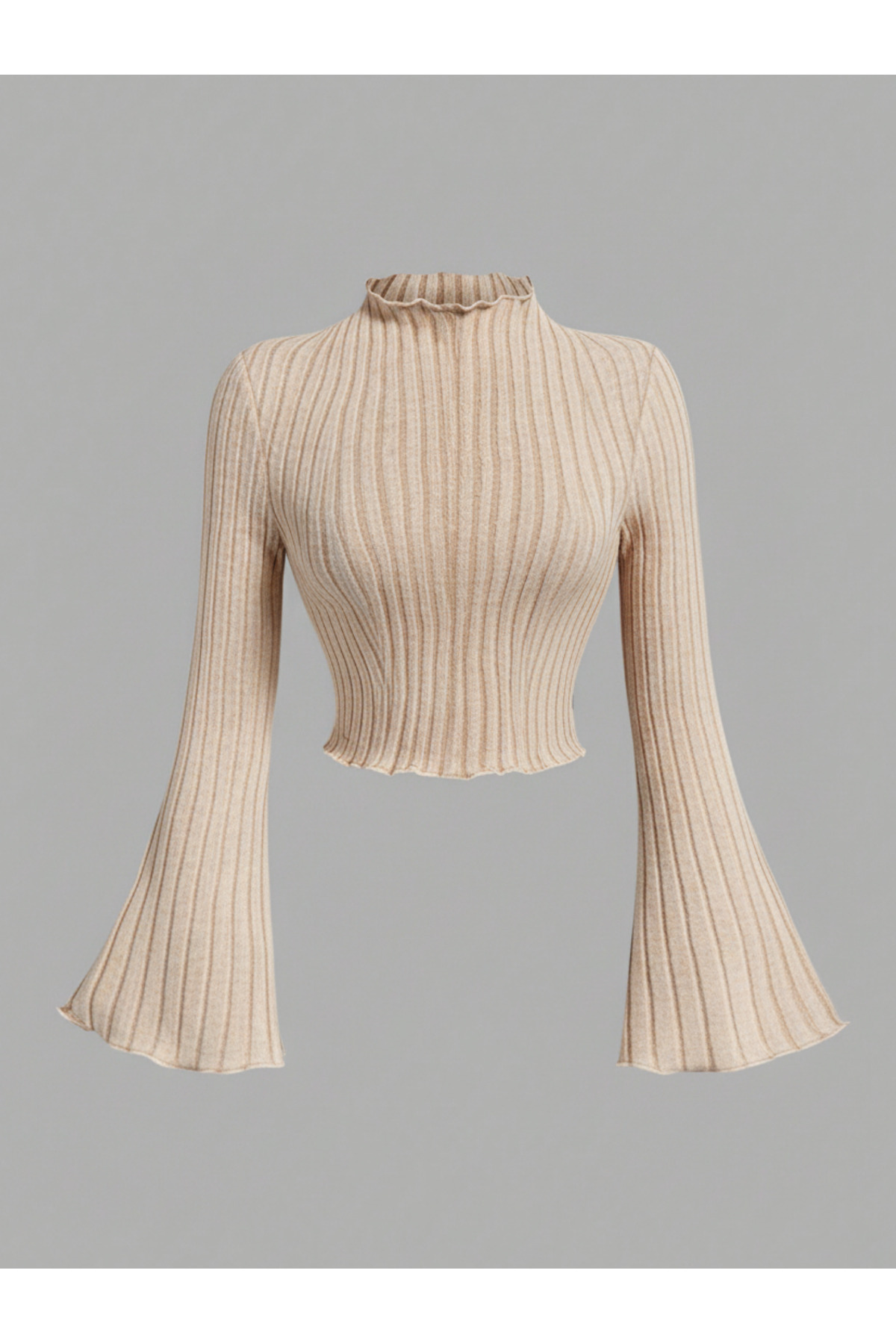 Bordo Fitilli Triko Bluz Uzun Kollu, Volan Kol, Dik Yaka Crop Üst