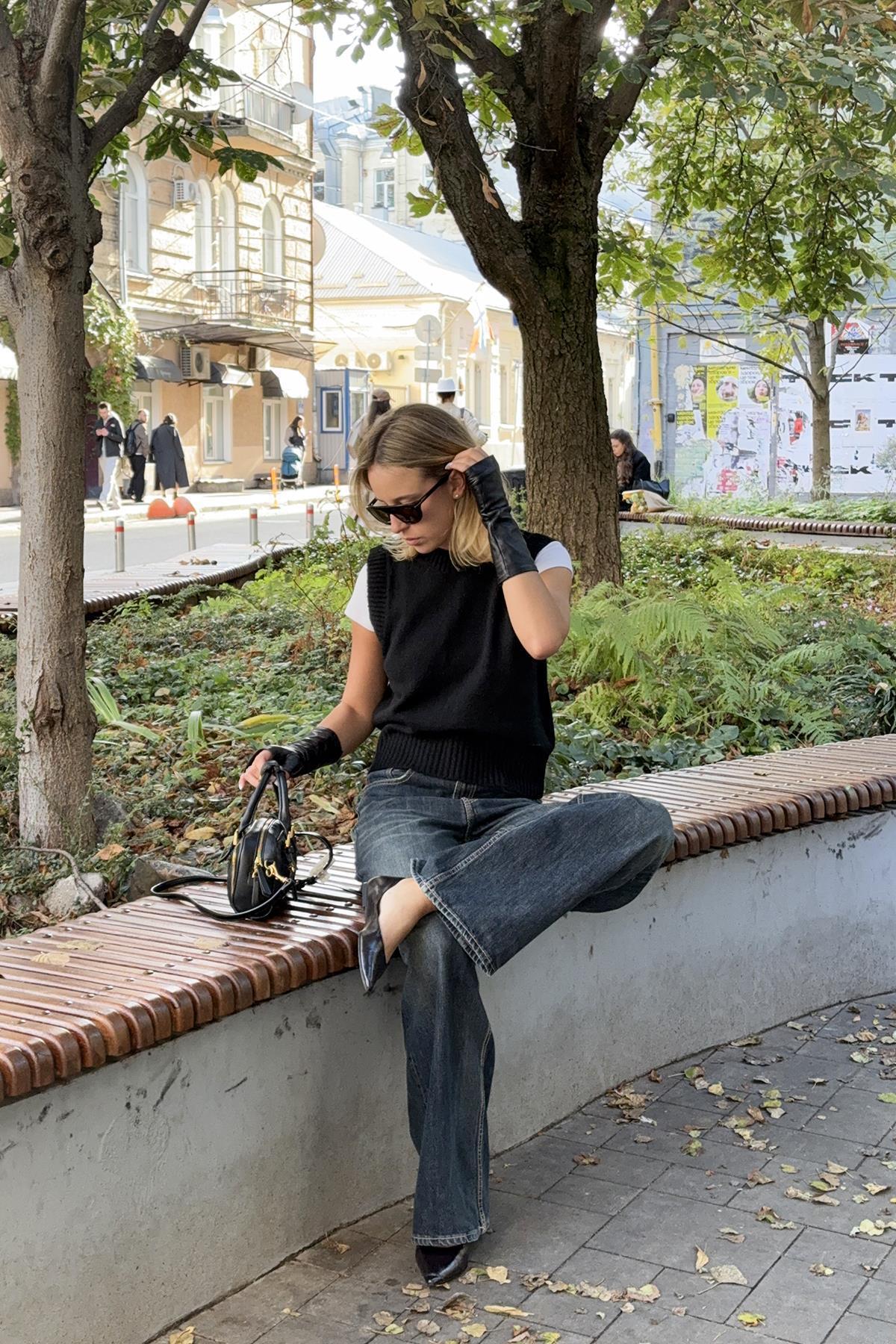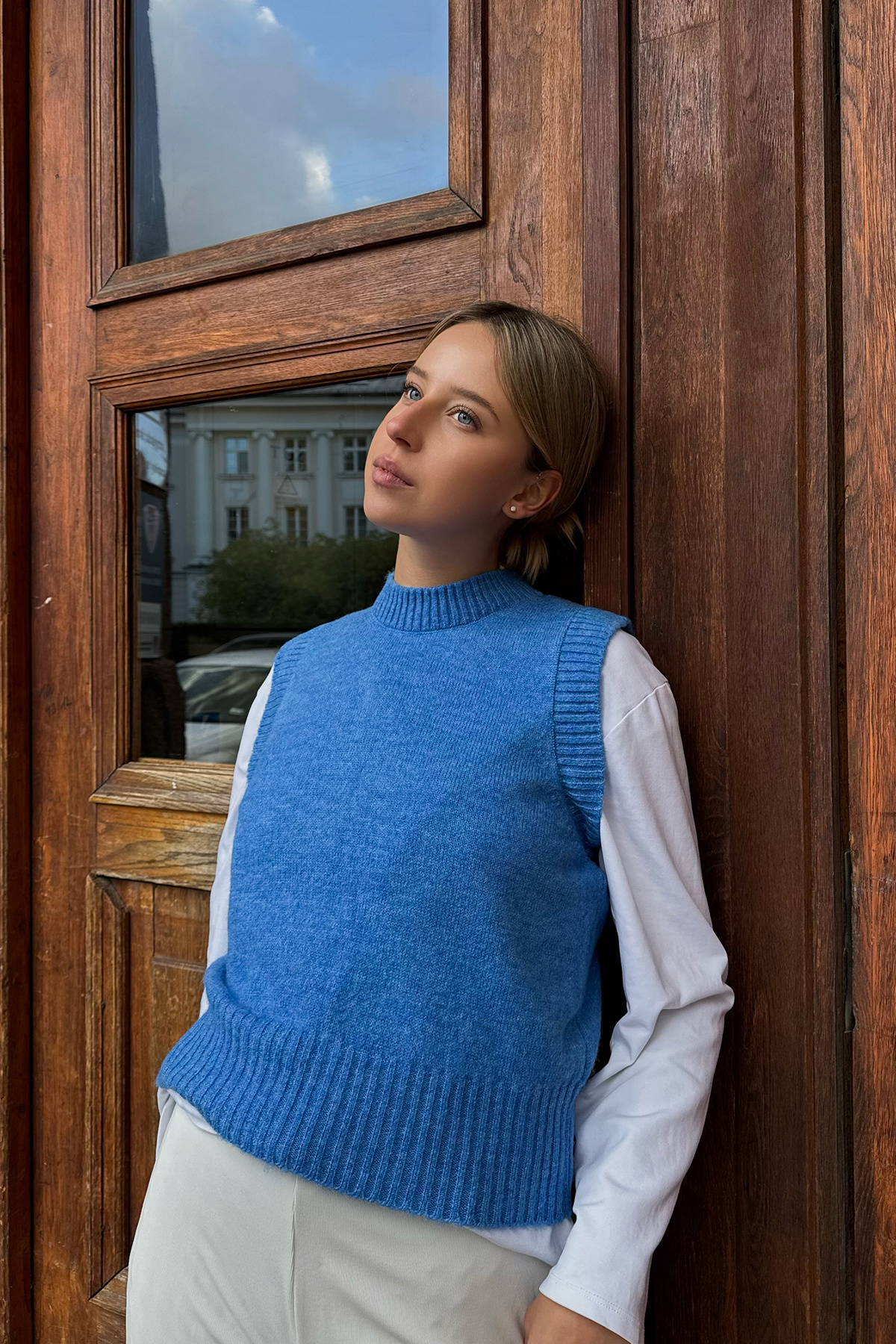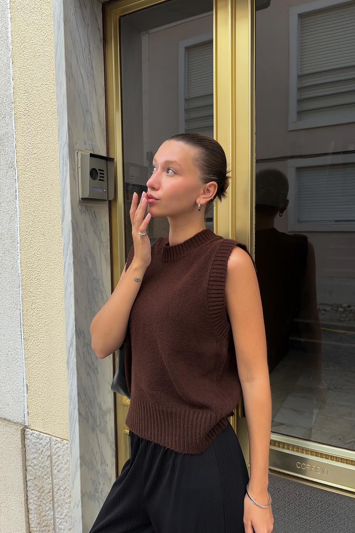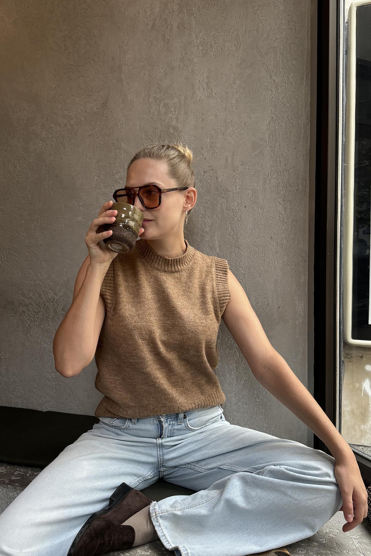 Regular fit, kolsuz, dik bisiklet yakalı, beli ribanalı yumuşak tuşeli Chuba triko süveter kolsuz kazak.
