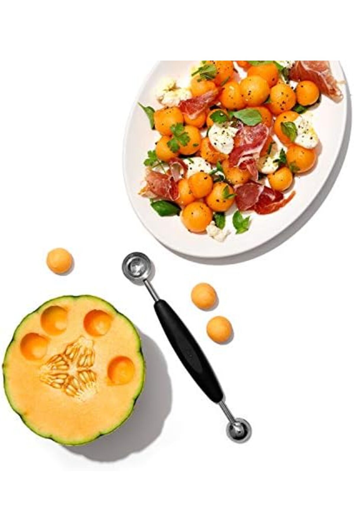 İyi Düşünülmüş Tasarım: Farklı boyutlarda iki yarım küreli kaşıklar Kaliteli Tasarım: Bu mutfak gereci, sağlam paslanmaz çelik başlıklara ve yumuşak, rahat bir sapa sahiptir Çok yönlü: Mutfak gereci, meyve salataları, süslemeler ve tatlılar için mükemmeldir temizlik: Bu mutfak gereci, bulaşık makinesinde yıkanabilir Good Grips Paslanmaz Çelik Kavun Kesicisi, Siyah/Gümüş