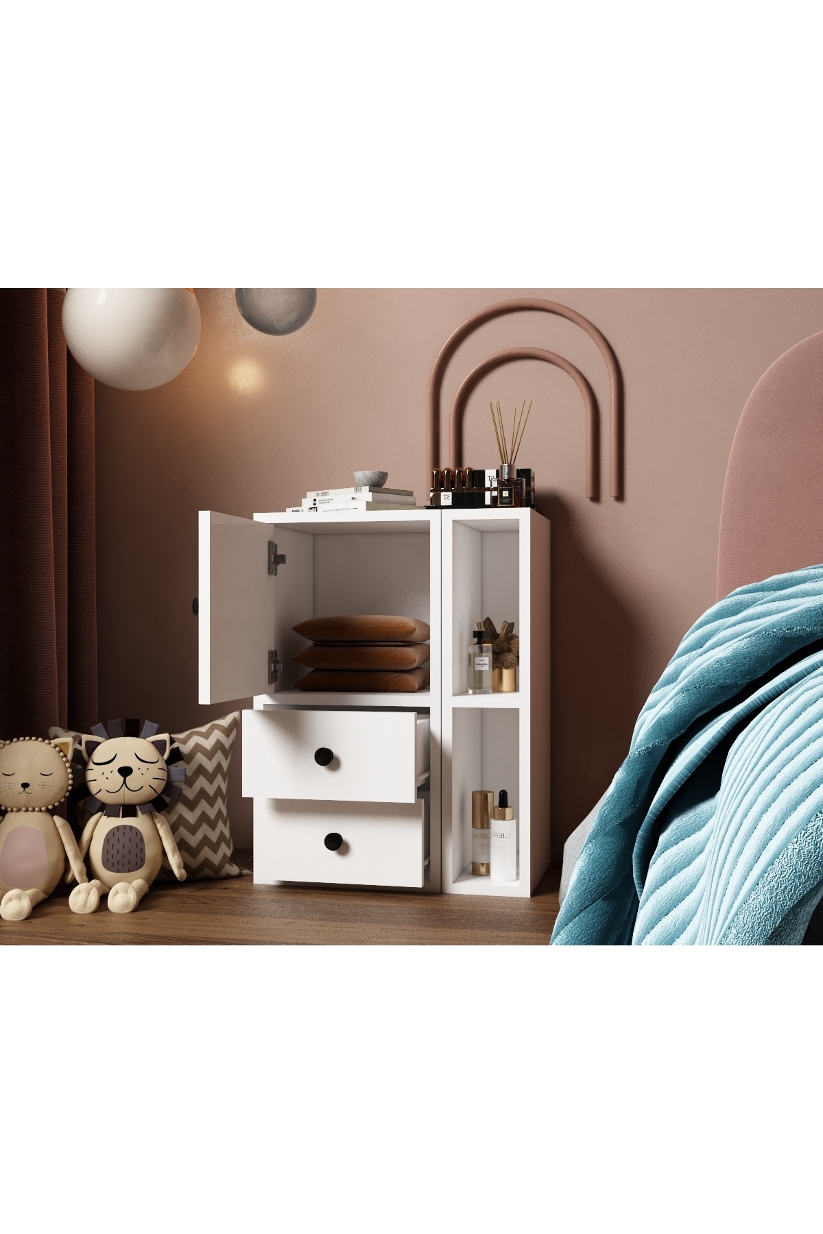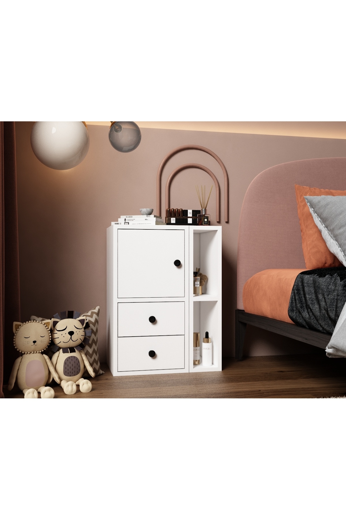 Malzeme & Renk Gövde/kapak/çekmeceler: 1. sınıf yonga levha veya MDF-lam (isteğe bağlı) Kenarlar: PVC bantlı Kulplar: yuvarlak düğme kulp Renk: Beyaz Fonksiyonel Özellikler Kapaklı bölme küçük eşyaları tozdan korur.