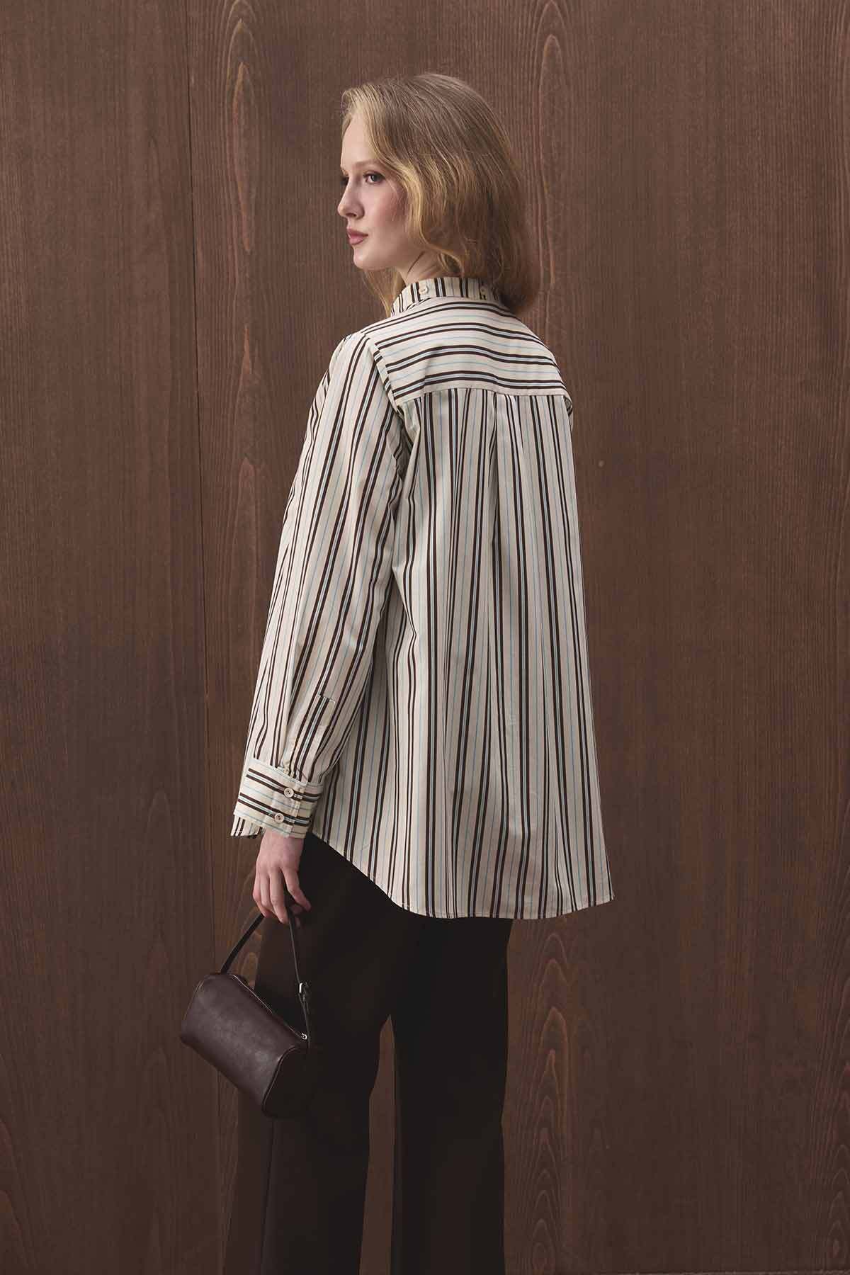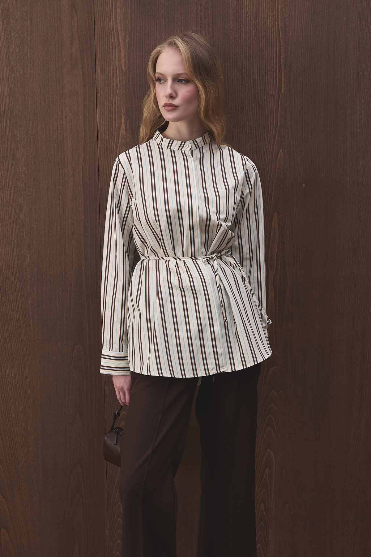 Pamuklu çizgili kumaştan üretilmiş, hâkim yaka, tak çıkar fular detaylı, gizli pat düğmeli, kendi kumaşından biye kemerli, rahat kesim premium çıkarılabilir bağlama detaylı çizgili poplin gömlek.