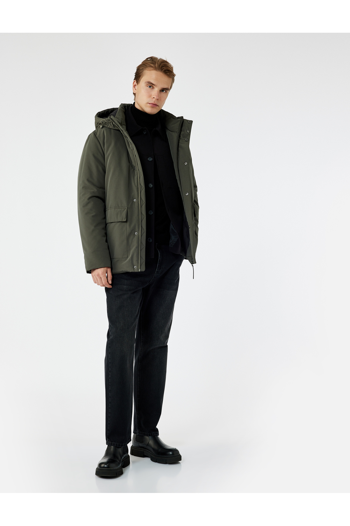 Çıtçıt Düğme Detaylı Fermuarlı Cepli Kapüşonlu Kışlık Şişme Ceket