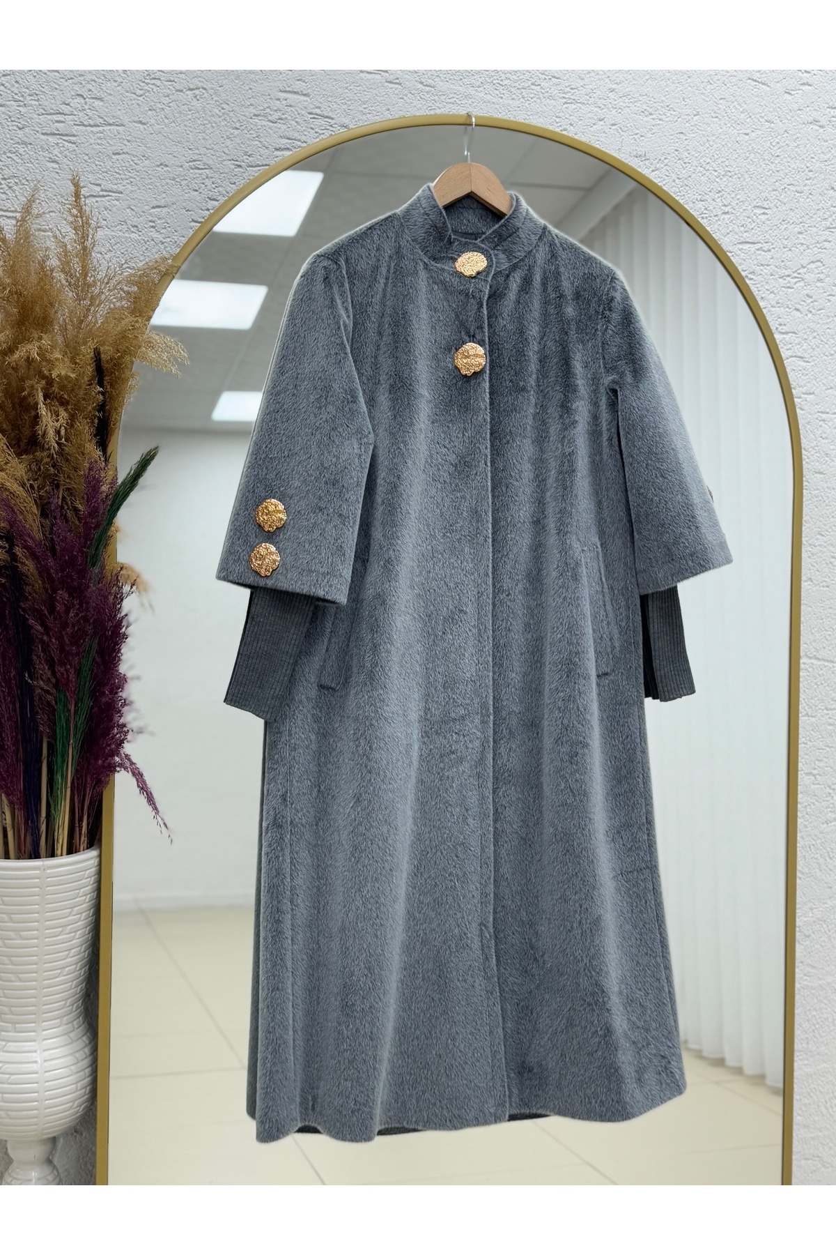 Cameva Kolları Büyük Düğmeli ve Lastikli Çift Cepli Uzun Kaban-BR7958 Gri