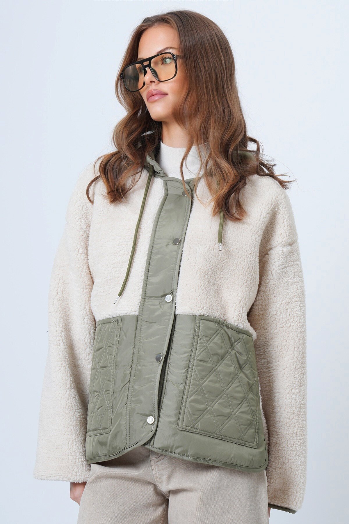 Kapüşonlu Peluş Dokulu Büyük Cepli Düğmeli Mont
