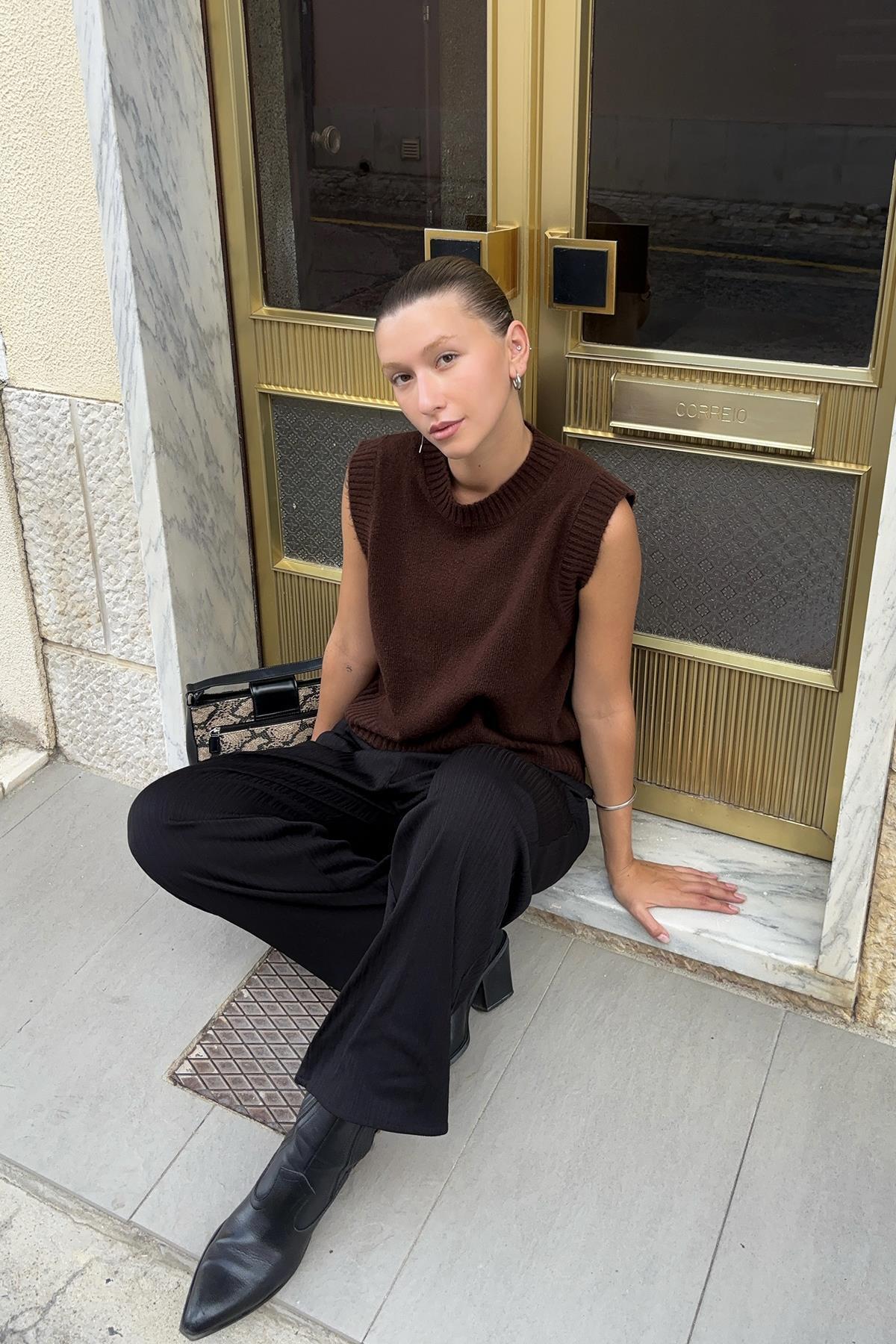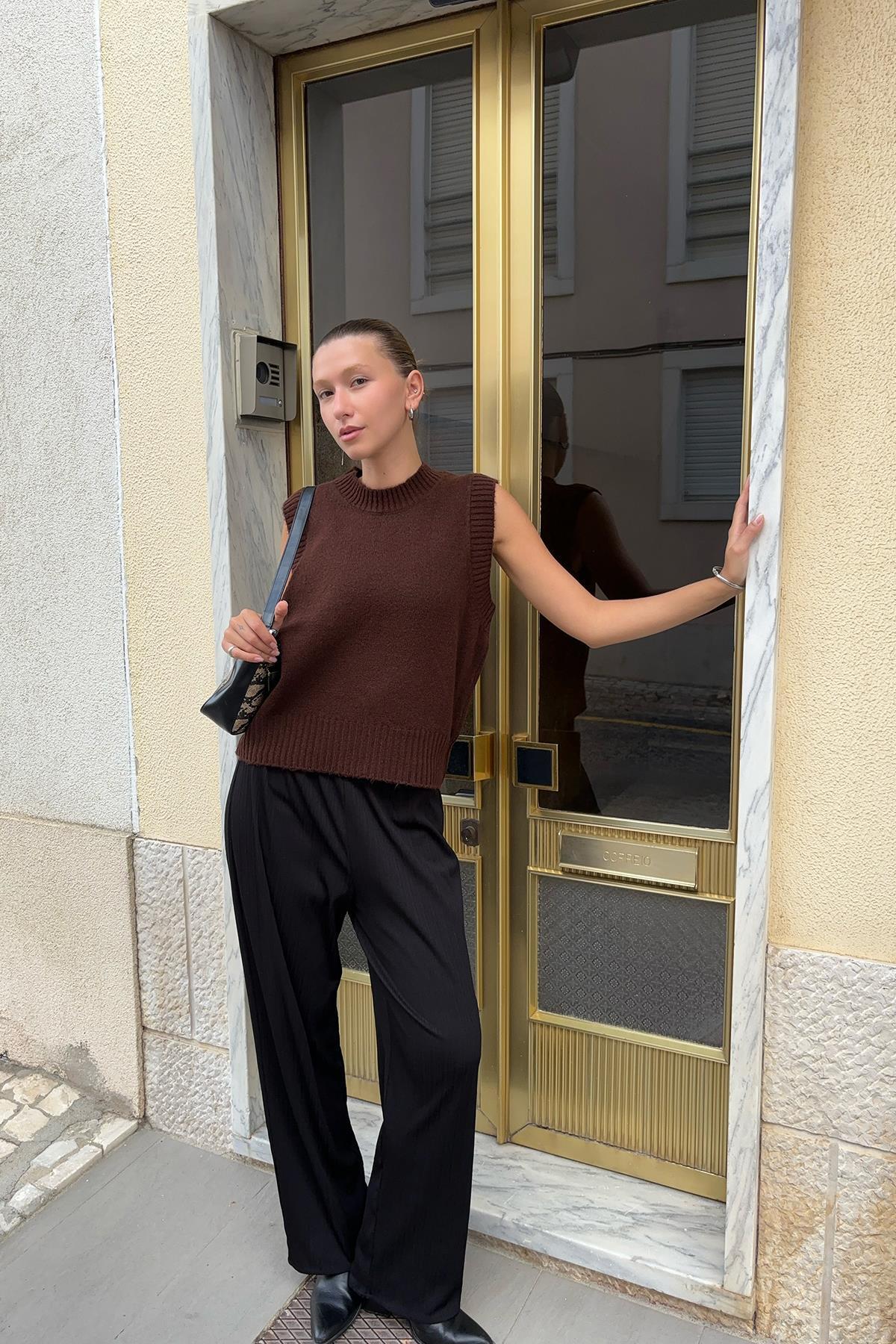 Regular fit, kolsuz, dik bisiklet yakalı, beli ribanalı yumuşak tuşeli Chuba triko süveter kolsuz kazak.