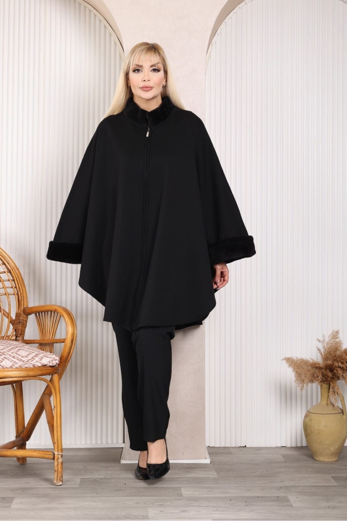 Yaka Ve Kollu Kürk Detaylı Çelik Kumaş Fermuarlı Panço Kaban