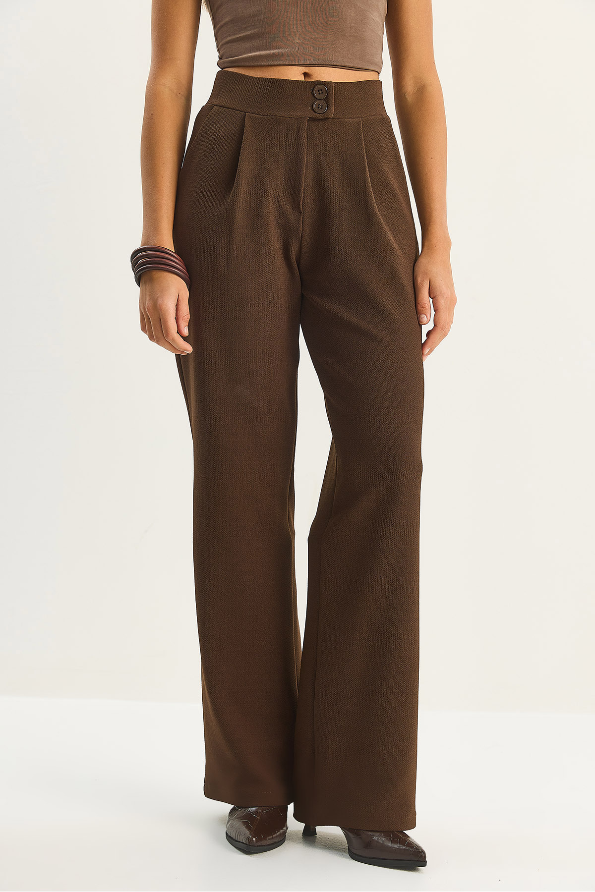 Ön kısmındaki çift düğmeli kapama detayı, pantolona zarif bir dokunuş katarken fermuar kapaması ile pratik bir kullanım sunar.