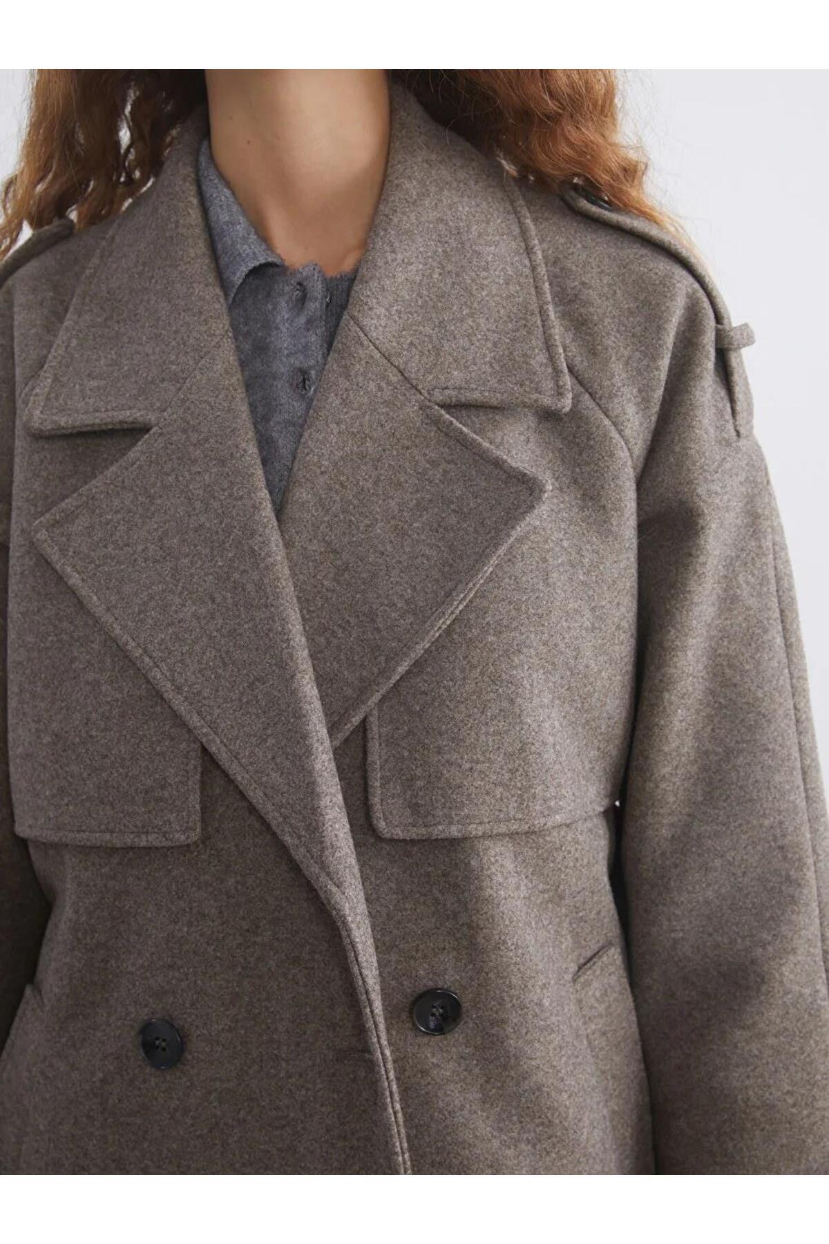 Kruvaze yakalı ve kruvaze düğme kapamalı kadın kaban, uzun kollu, omuz ve kol ucu apoletli olup beli kemerlidir.