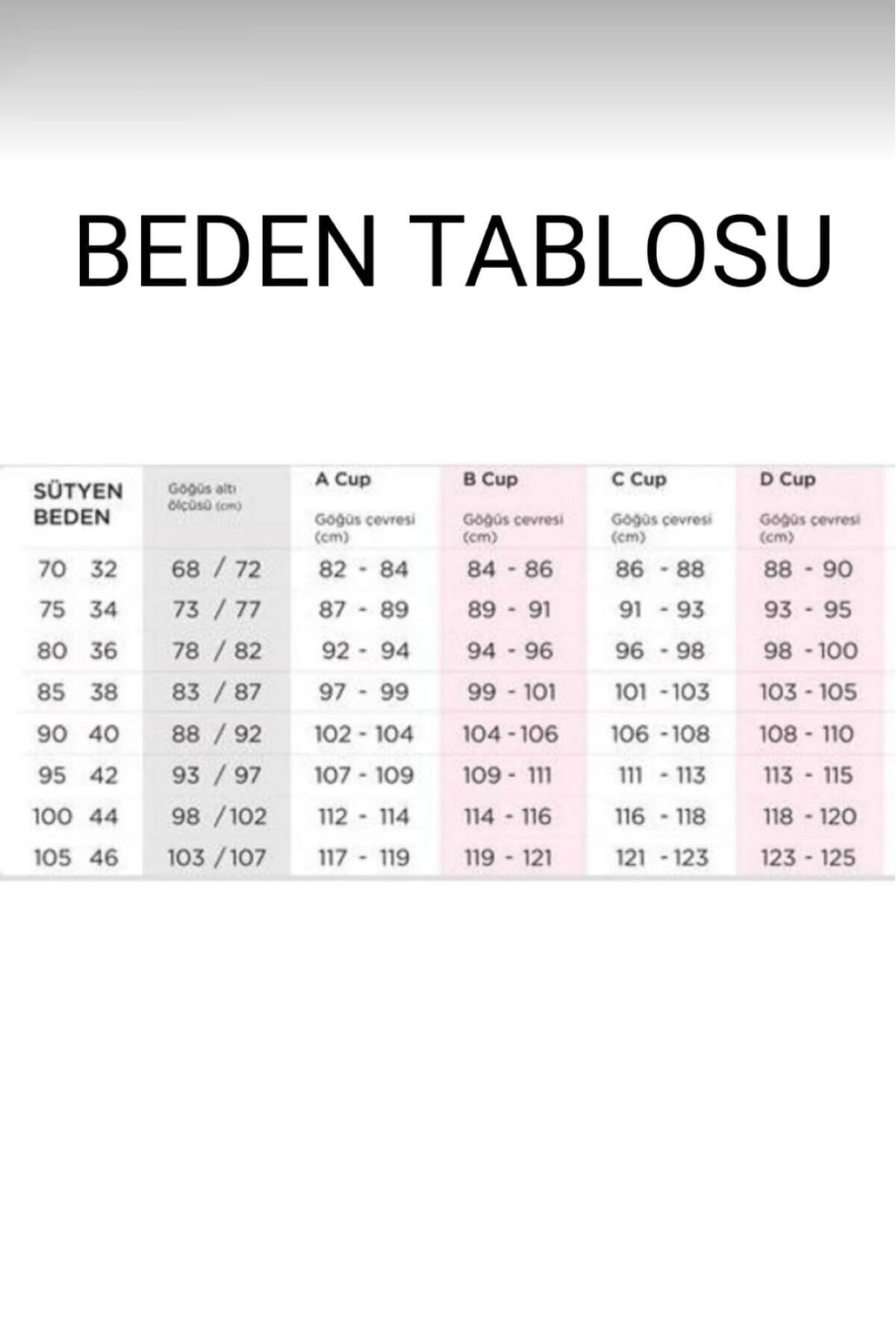 Kalıp: C Kap, Tam Kap Destek: Balenli, yüksek destek, toparlayıcı etki Konfor: Geniş ayarlanabilir askı, geniş arka bant, 3 kademeli kopça Görünüm: Nefes alan dantelli üst panel, pürüzsüz kaplar Kullanım: Günlük, uzun mesai, abiye/özel gün içi His: Esnek, yumuşak, terletmeyen kumaş Bakım Önerisi: Benzer renklerle 30° narin yıkama