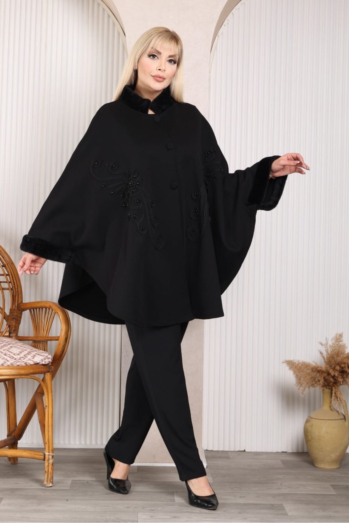 yaka ve kol ucu kürklü çelik kumaş nakışlı panço kaban