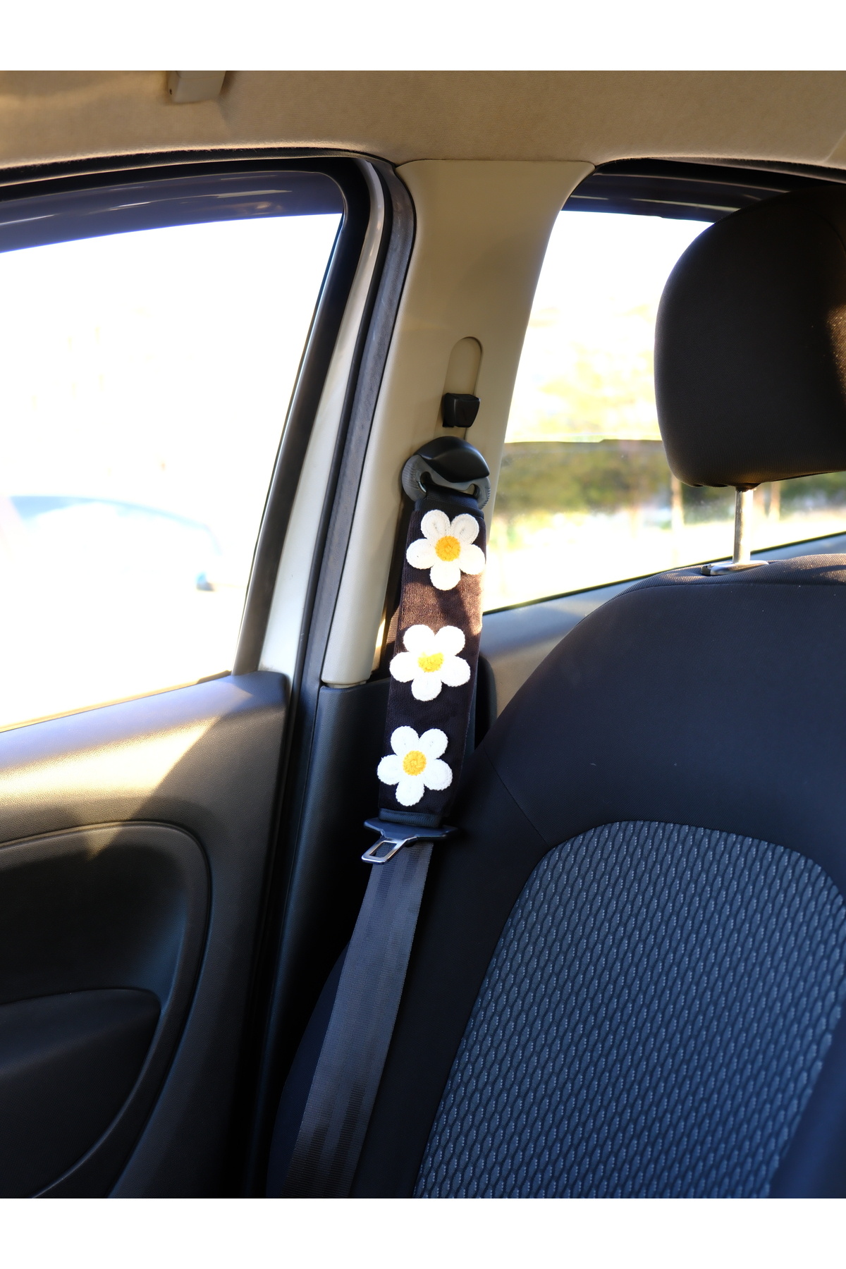 Beyaz Papatyalı Siyah Emniyet Kemeri Kılıfı 1 Adet Araç İçi Aksesuar Araba Hediyesi