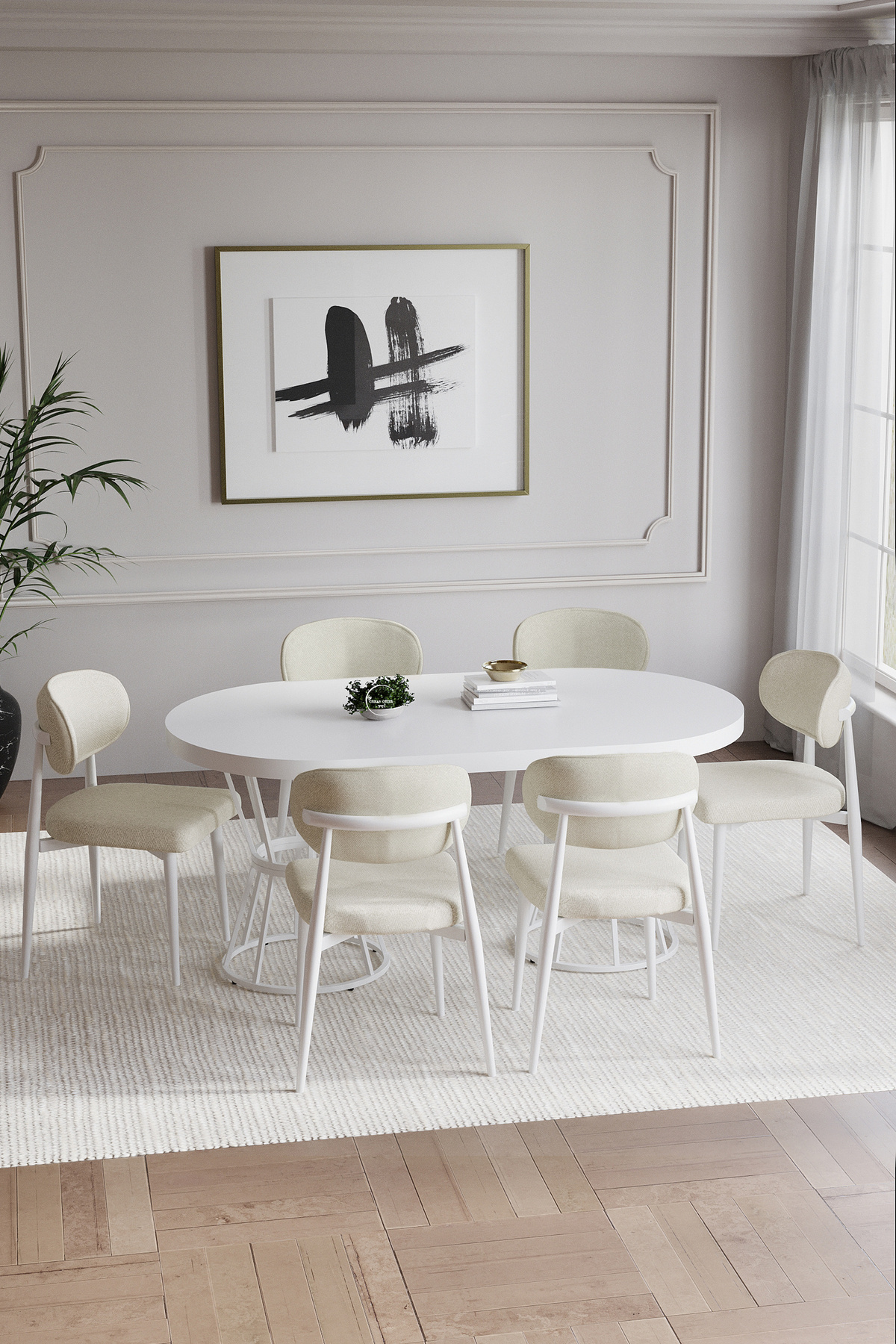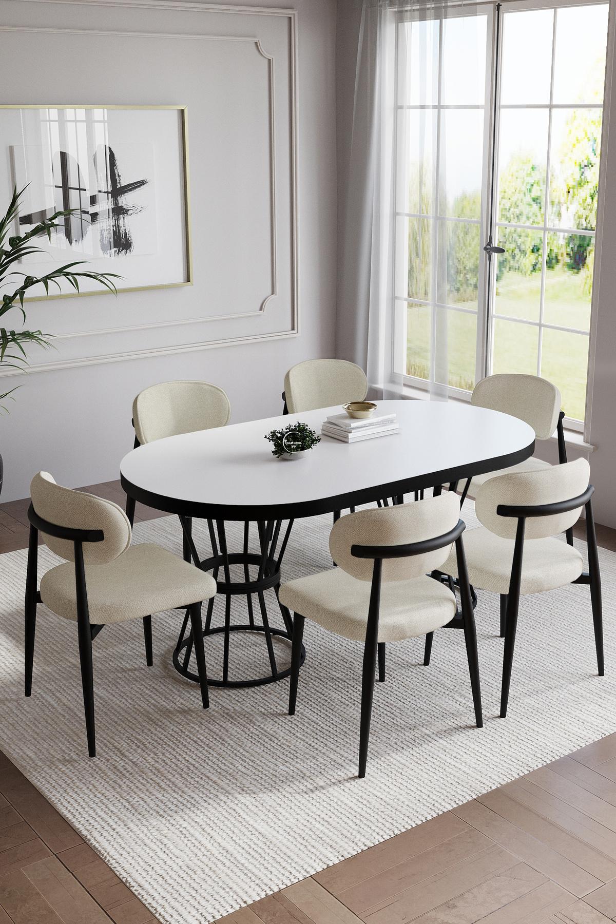 - PUFY kumaş kaplamalı sandalyeler, krem rengiyle şık ve zarif bir görünüm kazandırırken dayanıklılığıyla da öne çıkar.
