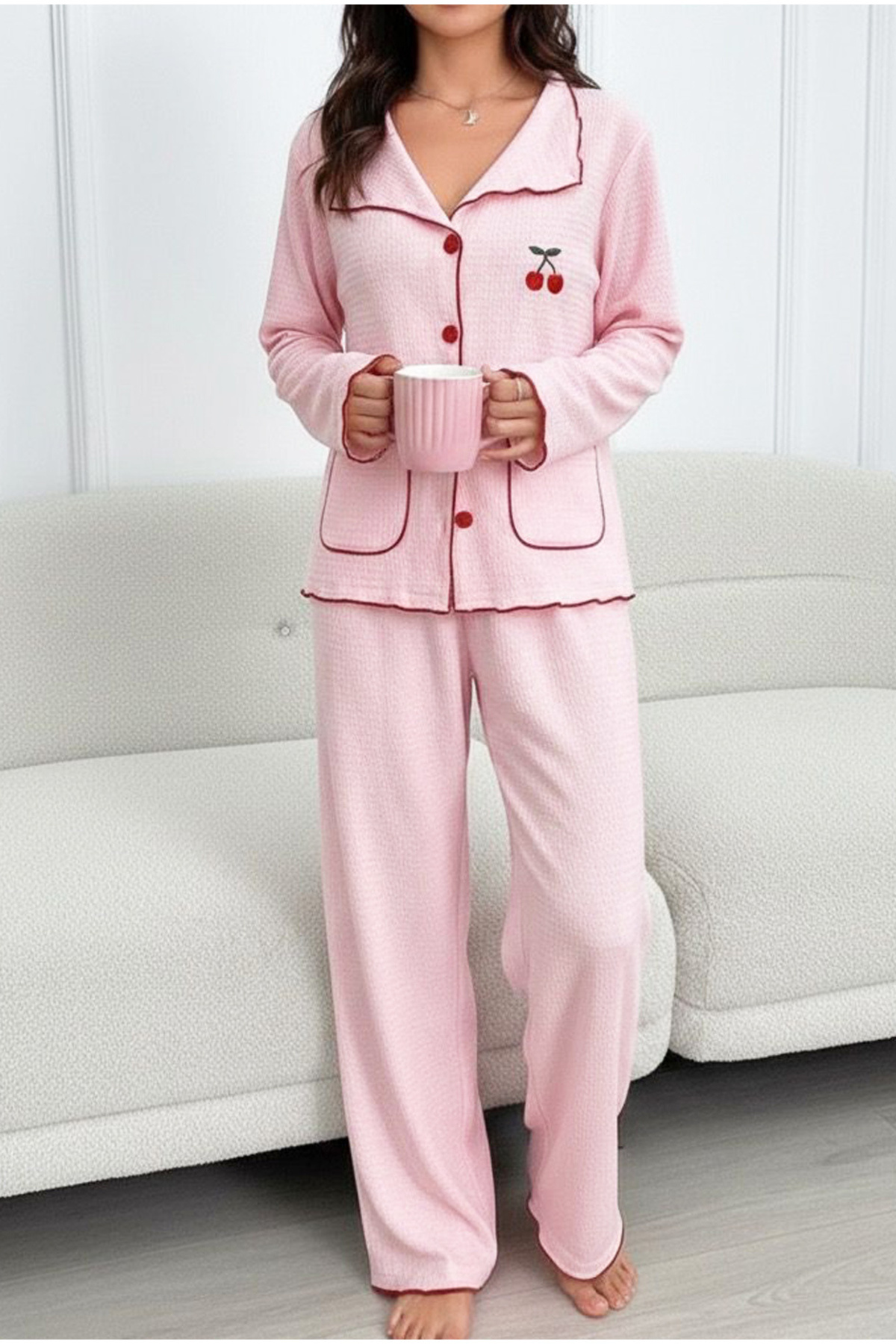Pembe Kiraz Nakışlı Cepli Bürümcük-Krınkıl Uzun Kollu Düğmeli Örme Pijama Takım 7941
