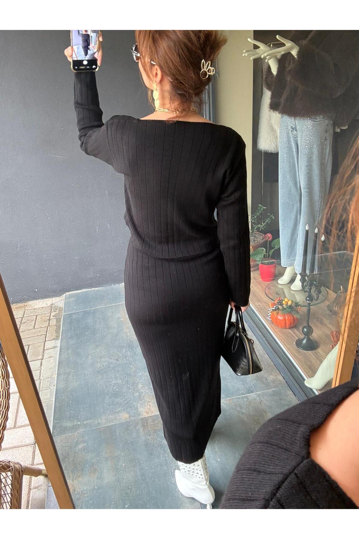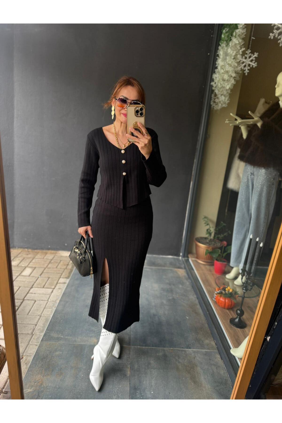 • • Takım Şıklığı: Hırka ve yırtmaç detaylı etekten oluşur.
