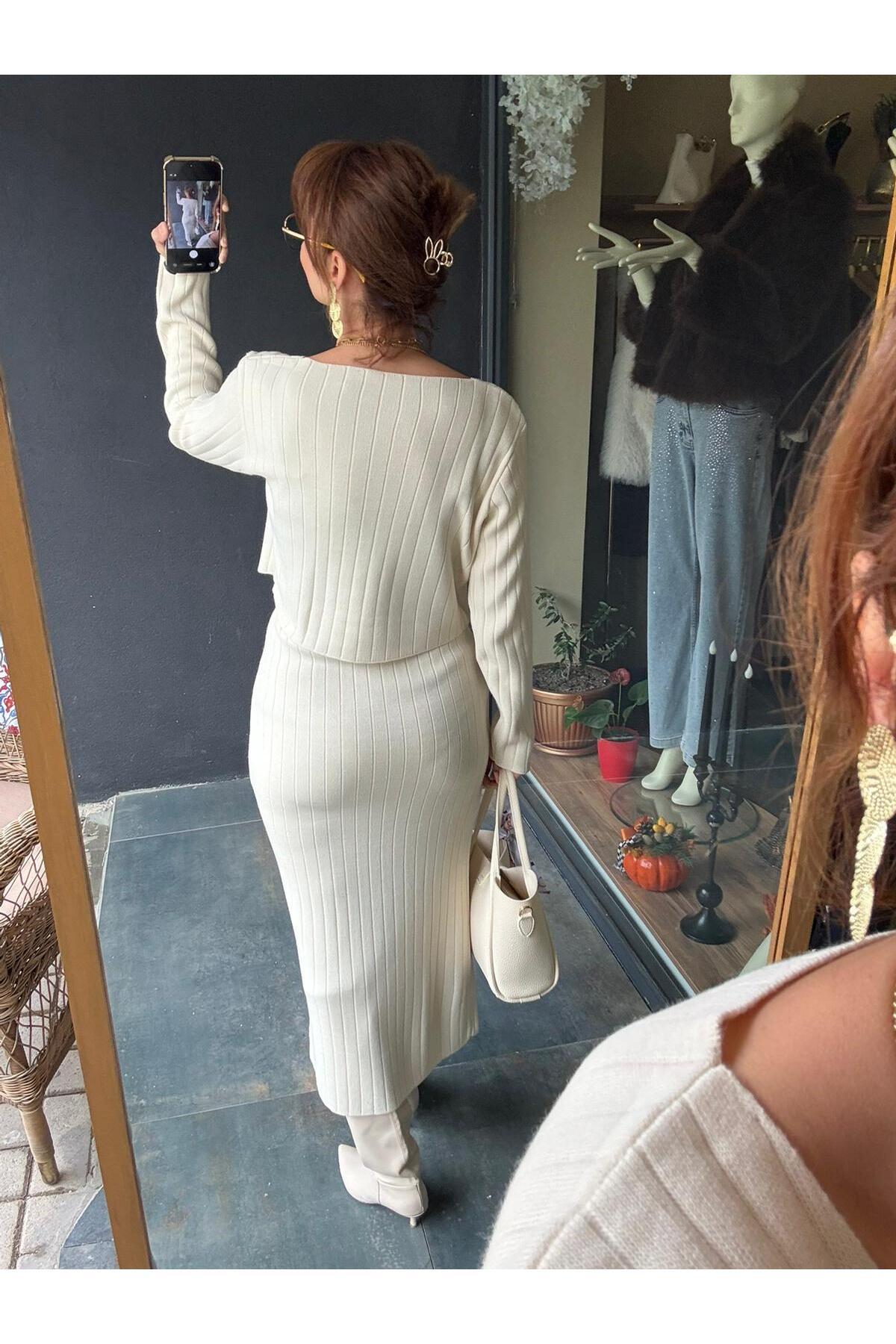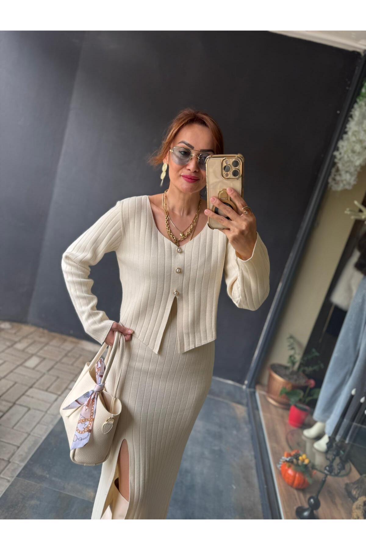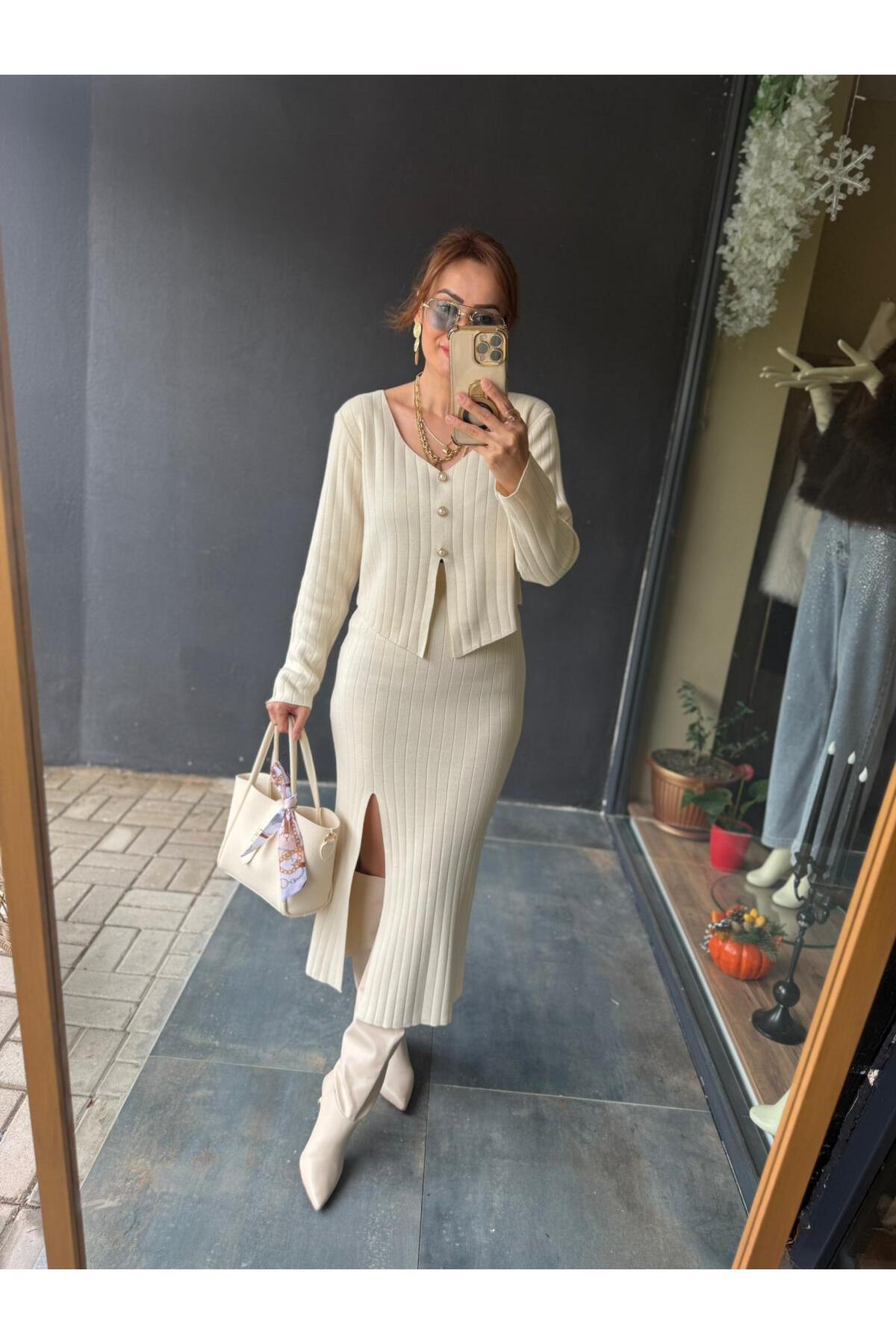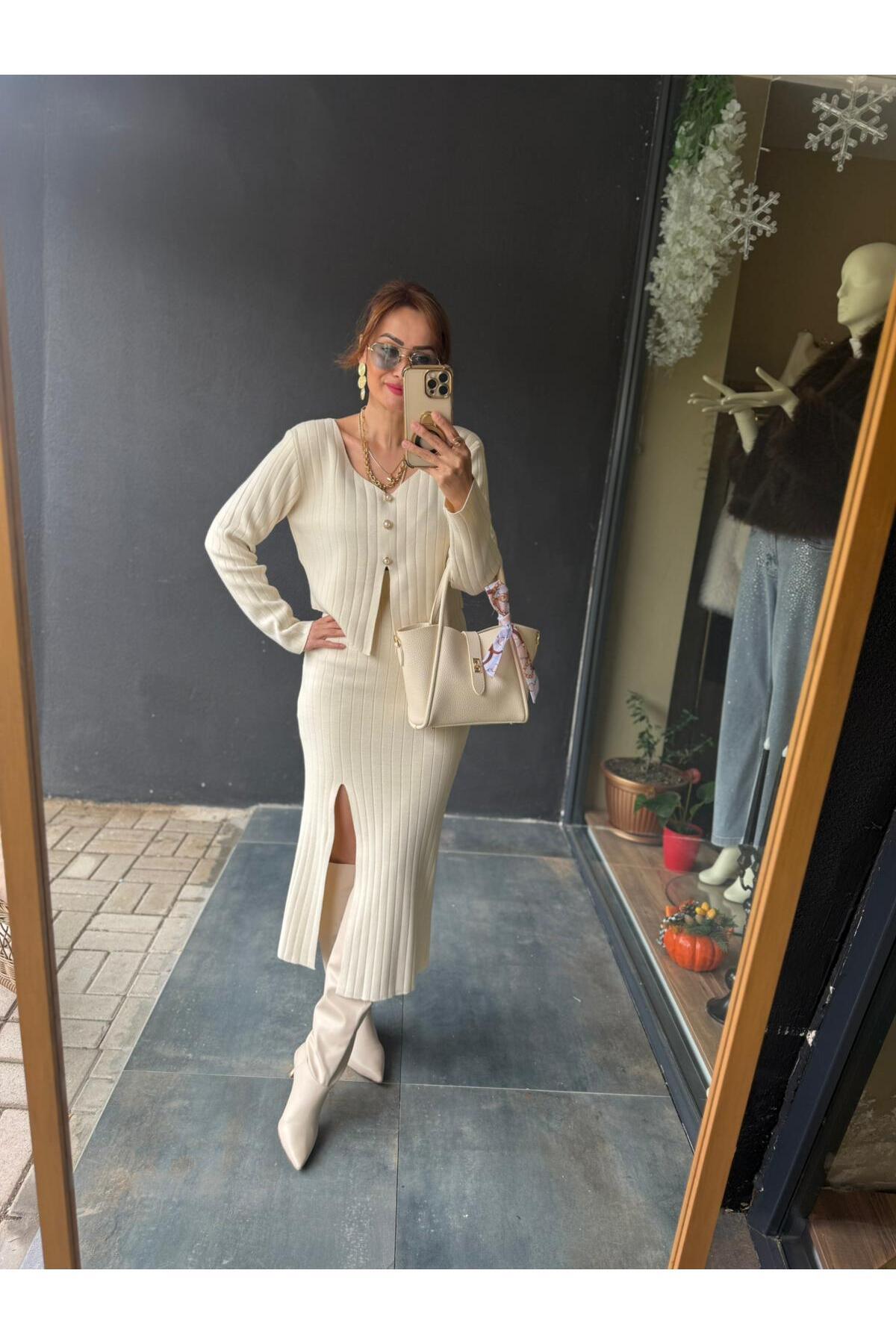 • Takım Şıklığı: Hırka ve yırtmaç detaylı etekten oluşur.