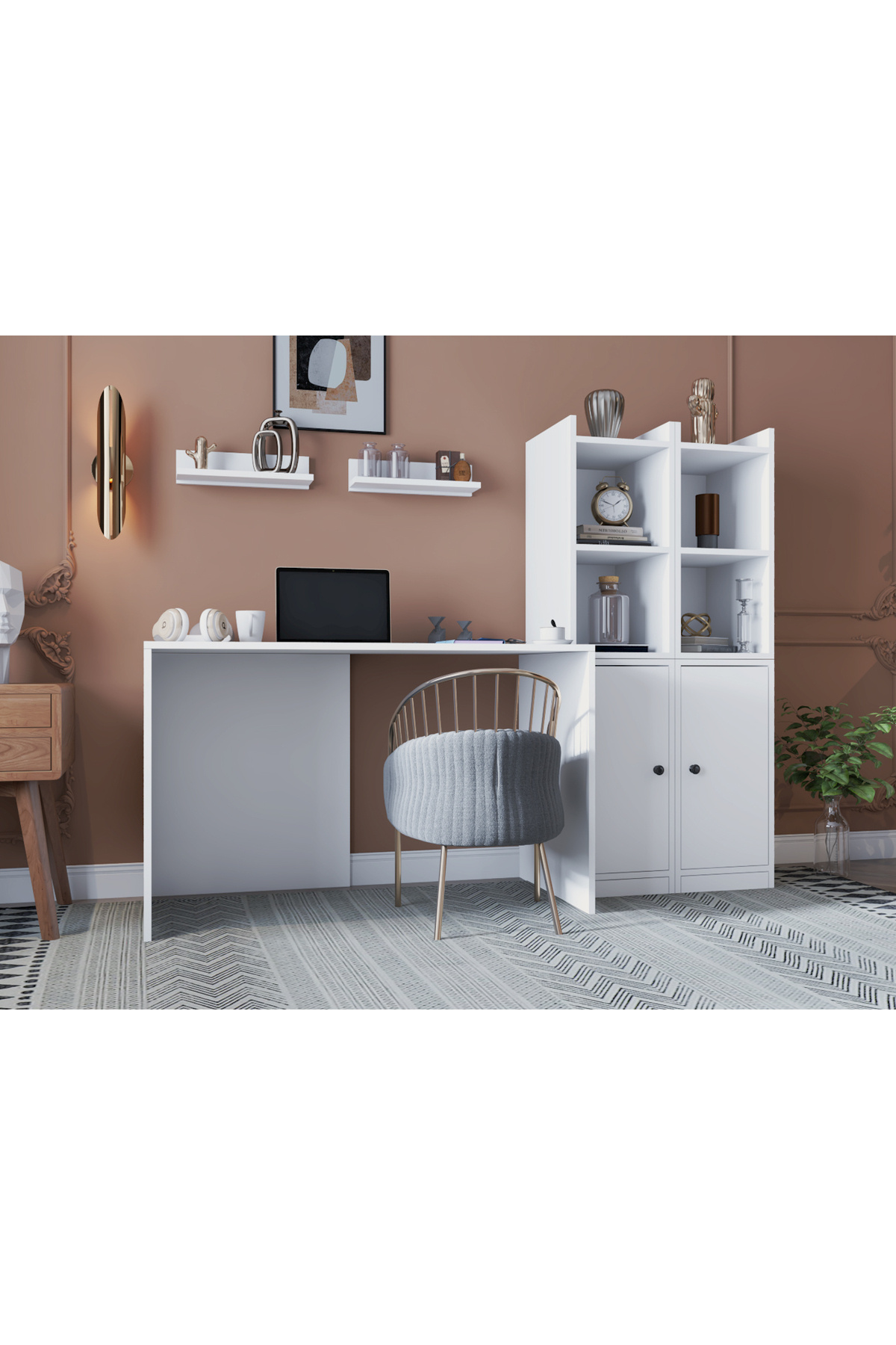 üstte iki bölmeli kitaplık, altta çift kapaklı dolap ve duvar rafları ile ekipmanlar, figürler ve kitaplar için düzenli alan sunar.