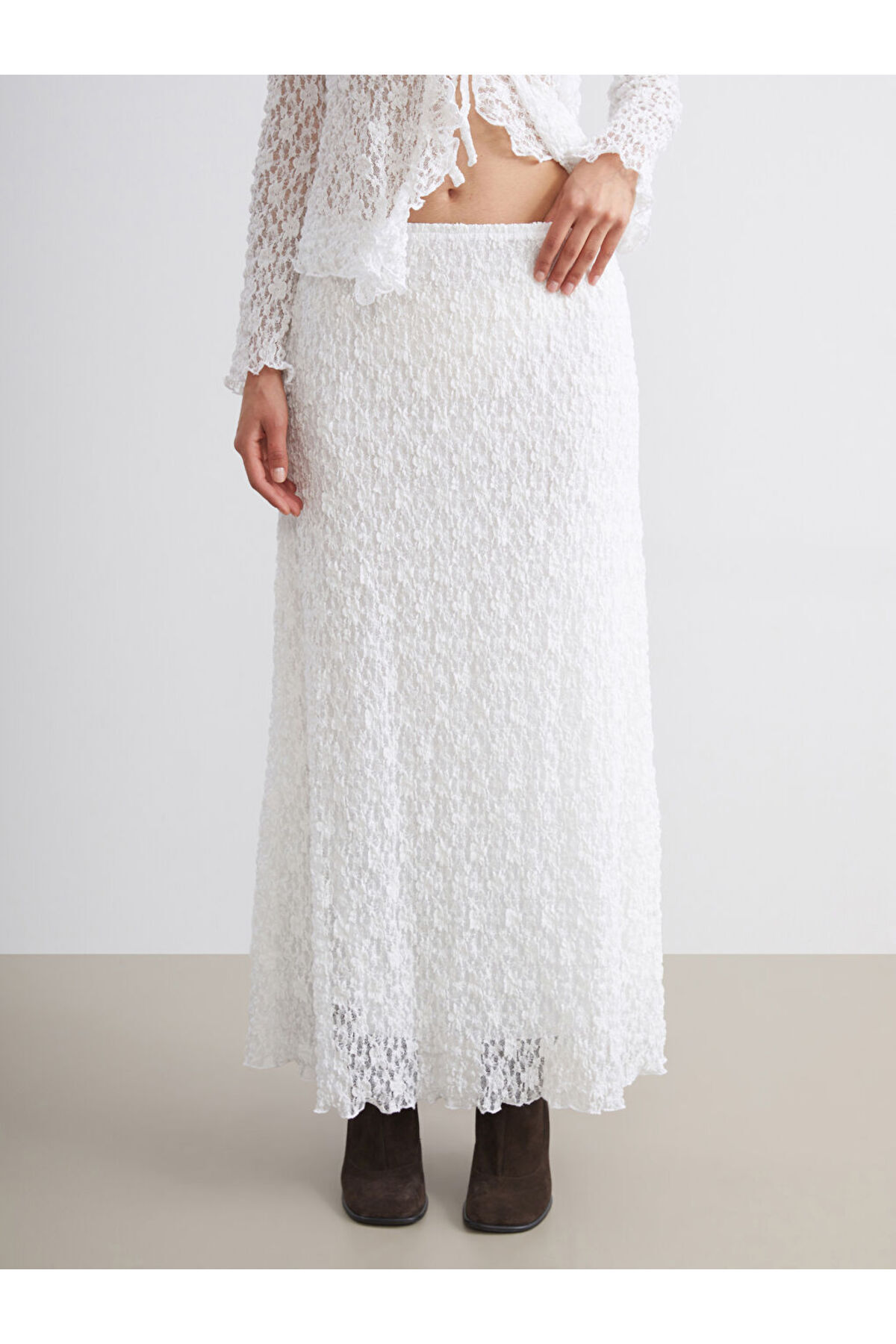 Ürün Kodu:W5LR29Z8-J5E - BeyazBeli lastikli kadın etek, dantelli kumaştan üretilmiştir.