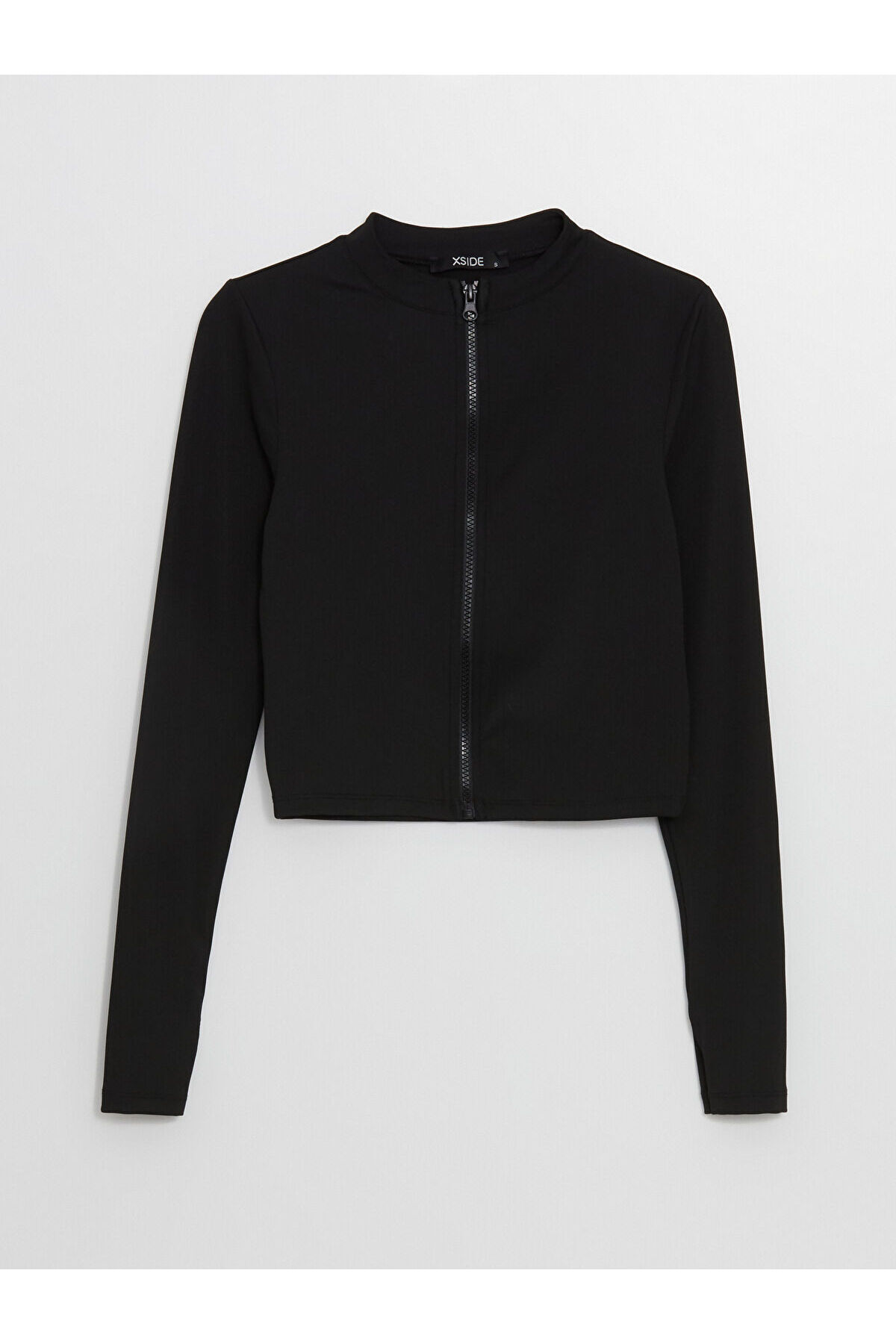 - Dik yaka düz uzun kollu crop spor hırka, interlok kumaştan üretilmiştir.