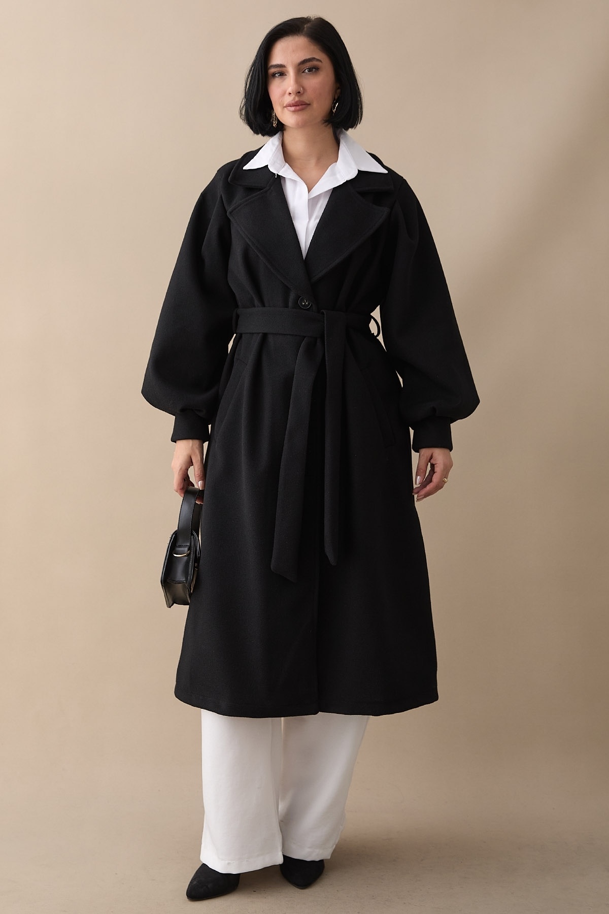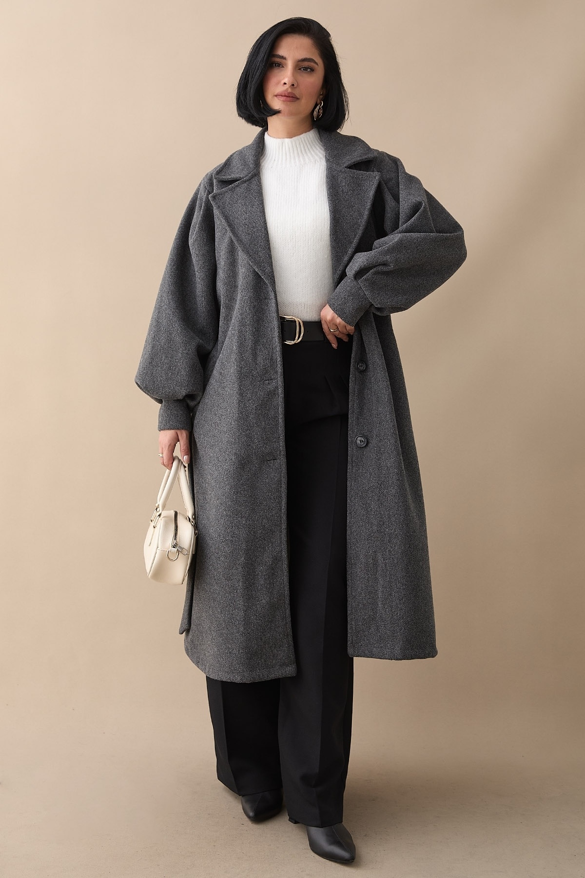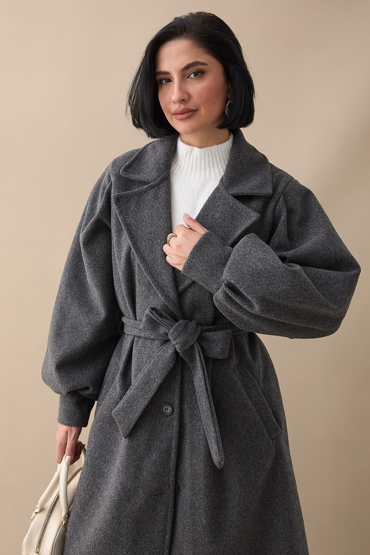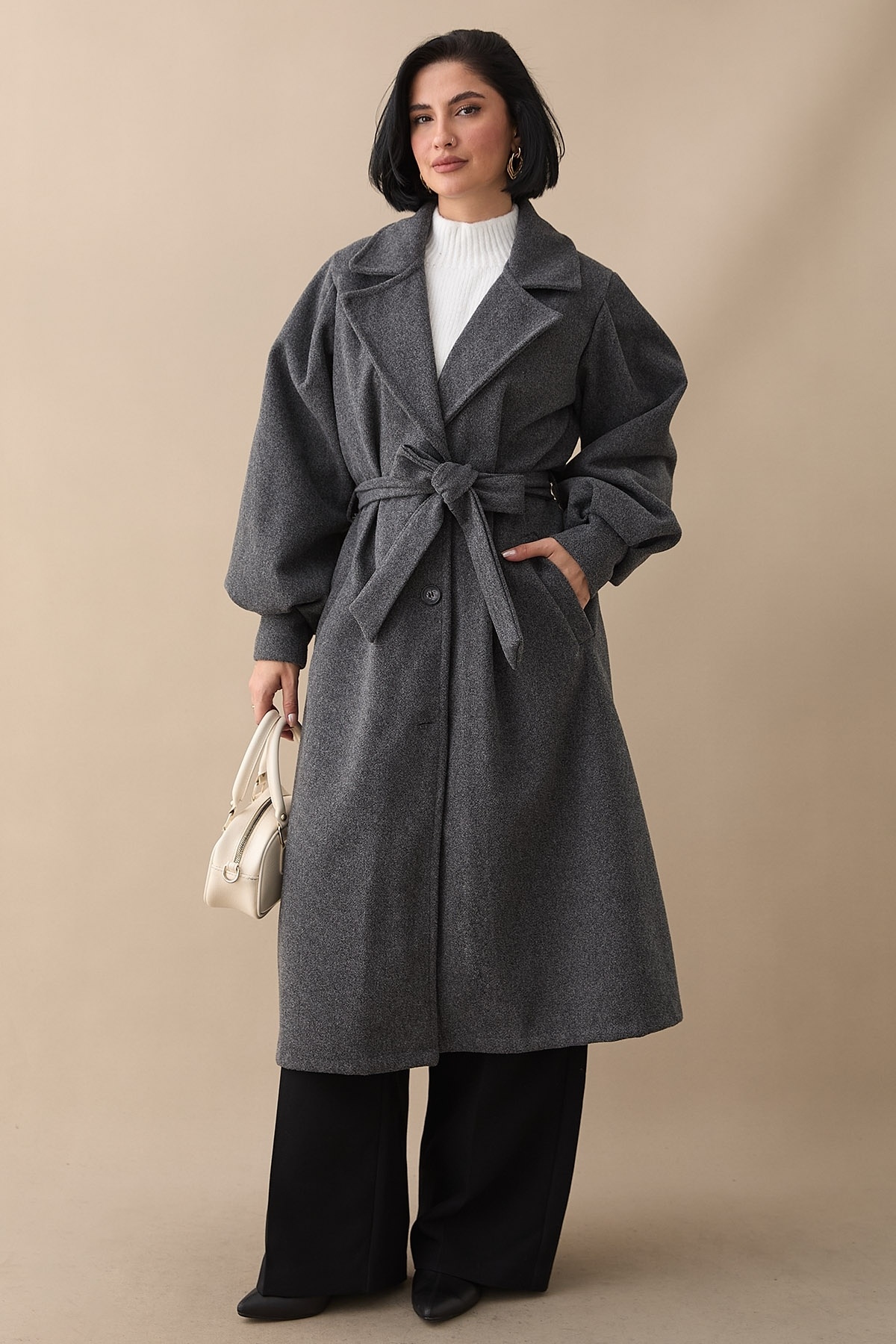 Kruvaze Balon Kol Kuşaklı Astarsız Kırçıllı Antrasit Kaşe Kaban